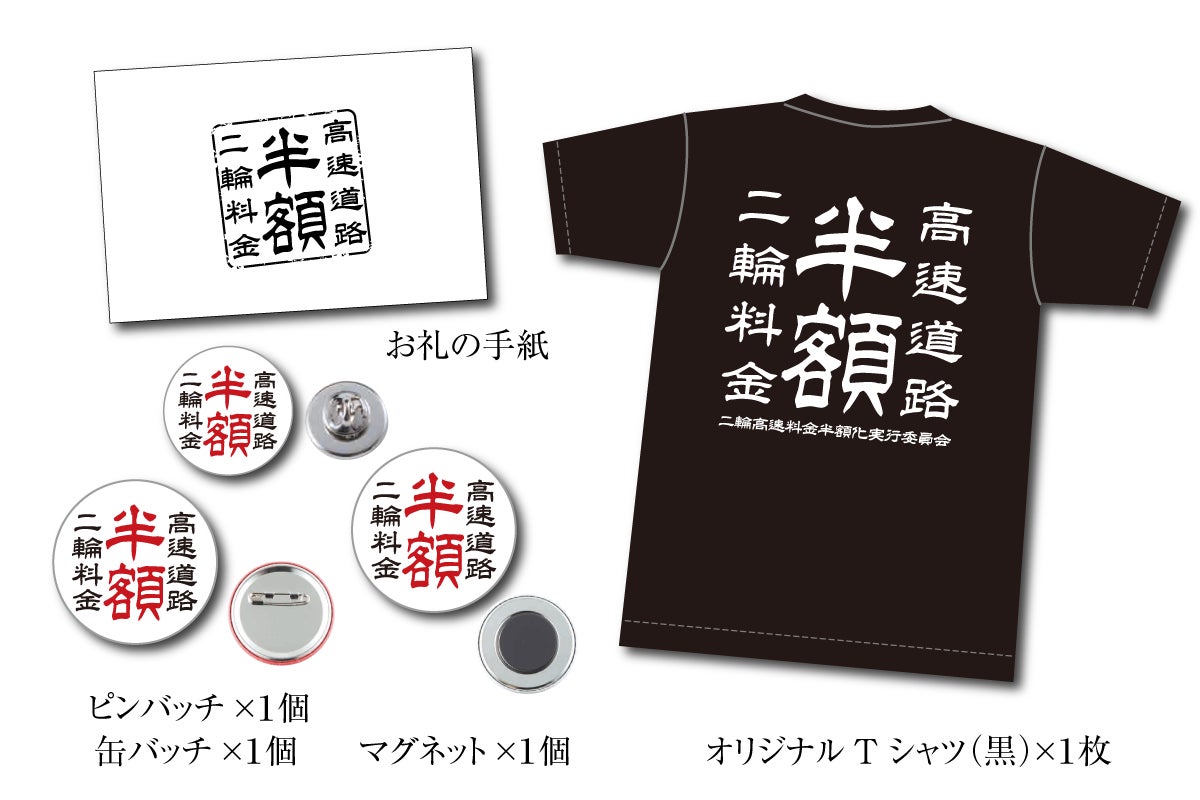 お礼のお手紙、二輪高速料金半額化のパンバッチ・缶バッチ・マグネットのセット