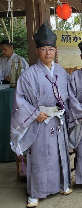 地方公務員として勤務。仕事の傍ら、雅楽や、神社に奉仕。三社祭、神田明神祭などでは猿田彦を務めるなど、様々な神社で奉仕活動を30年間続けている。日本の伝統文化をヨルダンの子どもたちに伝える。