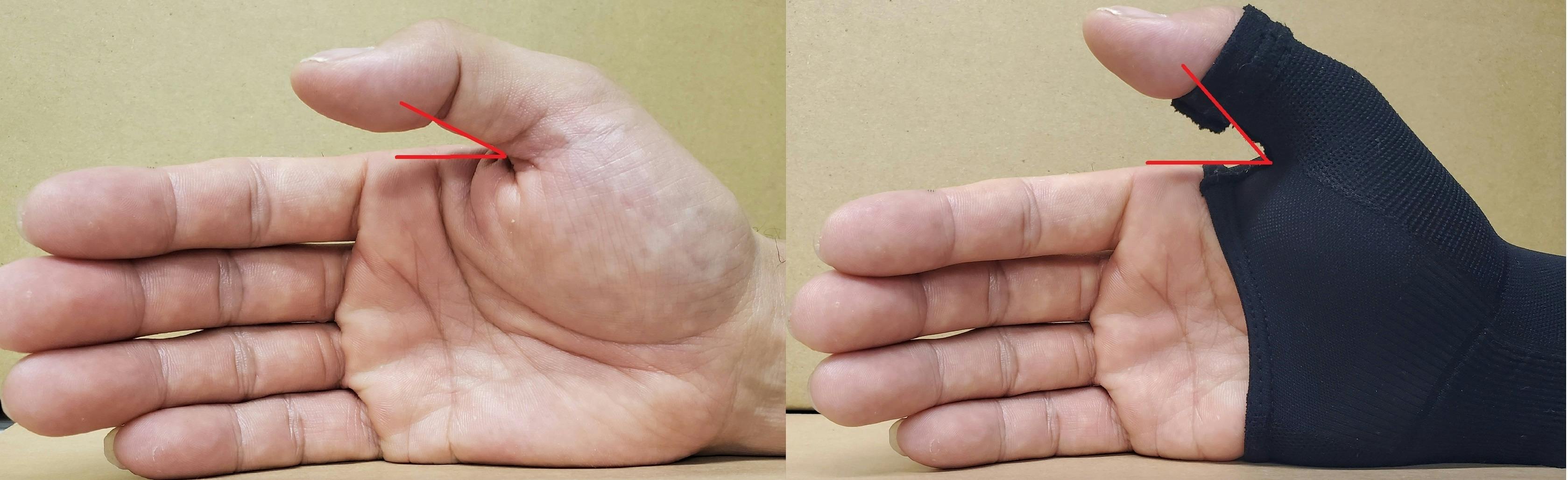 ★サポーターの装着前と装着後では親指の位置が高くなっています 。
