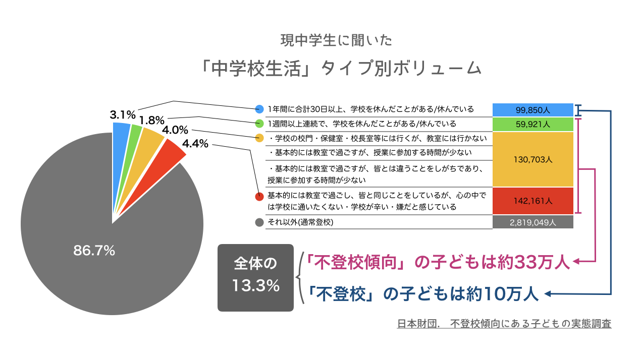 文科省の調査によると、現在、全国には不登校の小中高生が約19万人いるとされています。また、不登校または不登校傾向にあるとされる中学生は約43万人で、これは全体の13.3%にも当たる数字です。