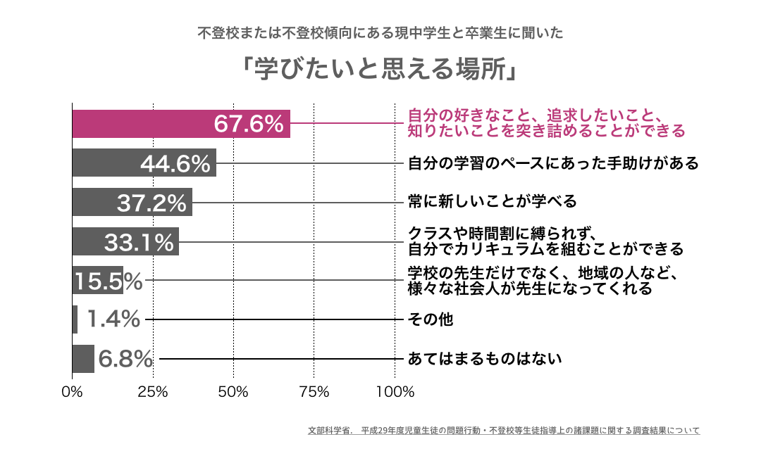 日本財団の調査では、不登校および不登校の傾向があるこどものうちの68%が、学びたいと思える場所として 「自分の好きなことを突き詰めることができる環境」を選択したという結果が出ています。