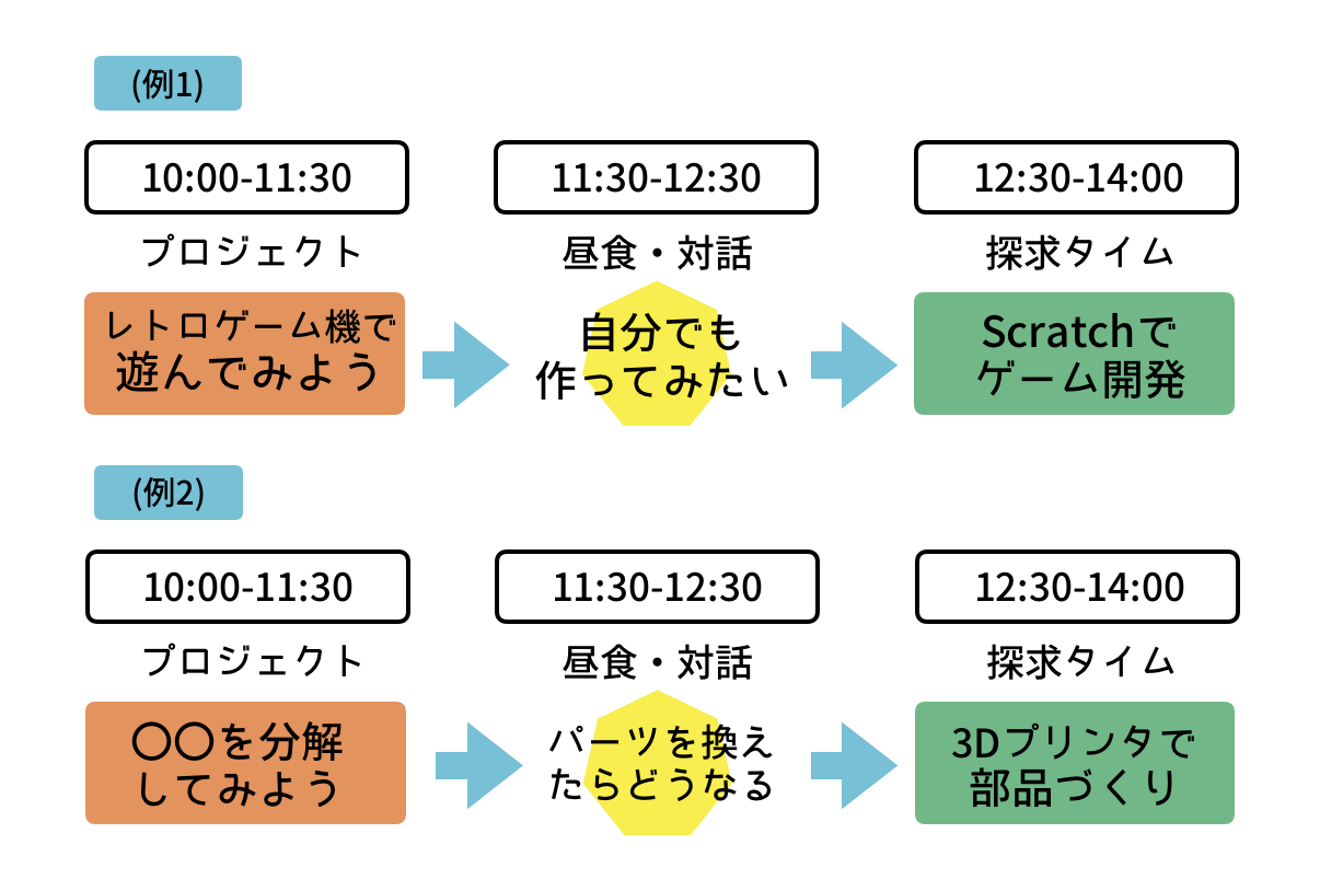 そうしてこども達の学びにキッカケをつくってあげ、後半のフリータイムでは、自分が興味を持ったことを調べたり、つくりたいと思ったものを制作したりできるよう、教室の設備を開放・活動の補助を行います。