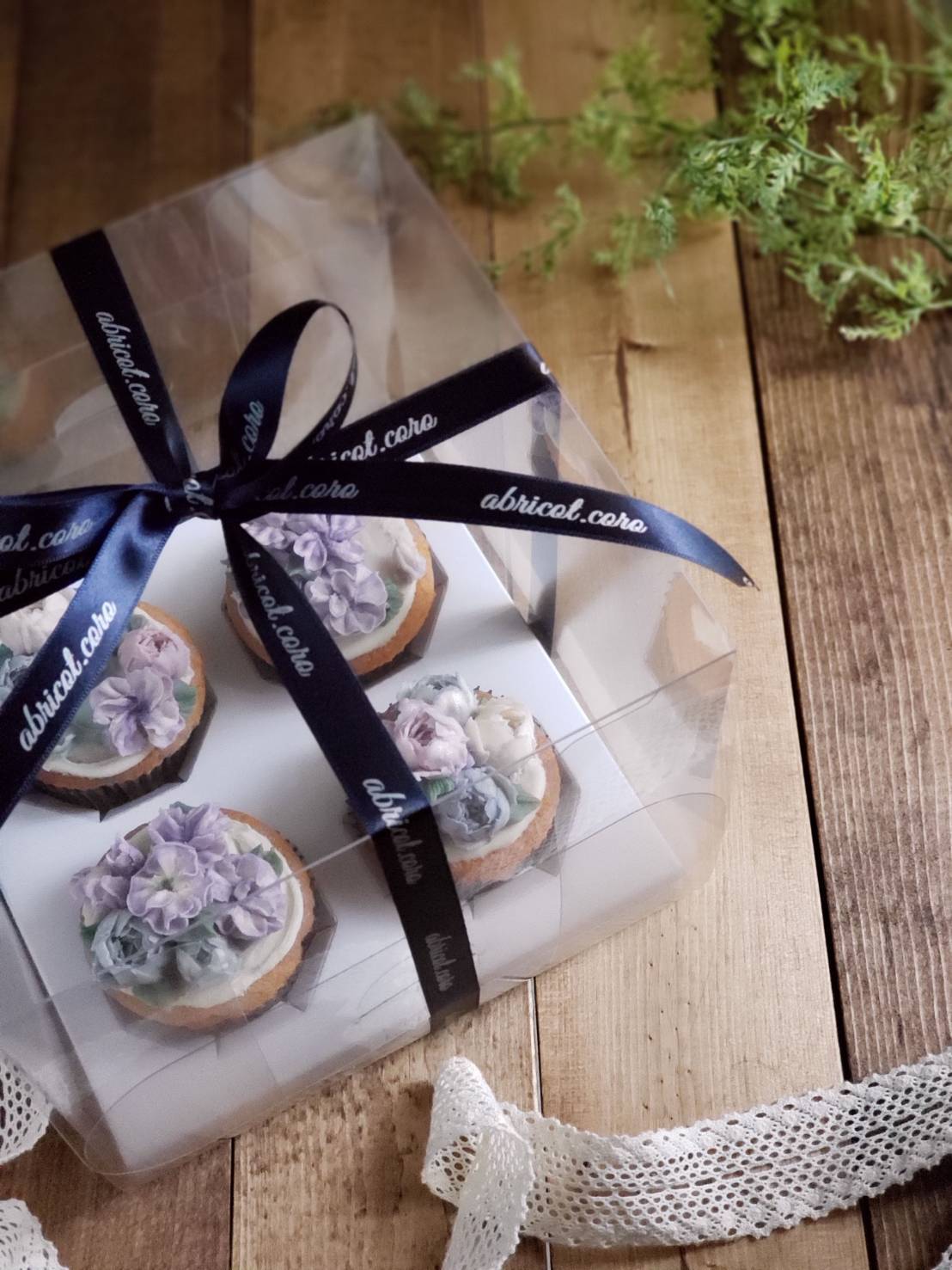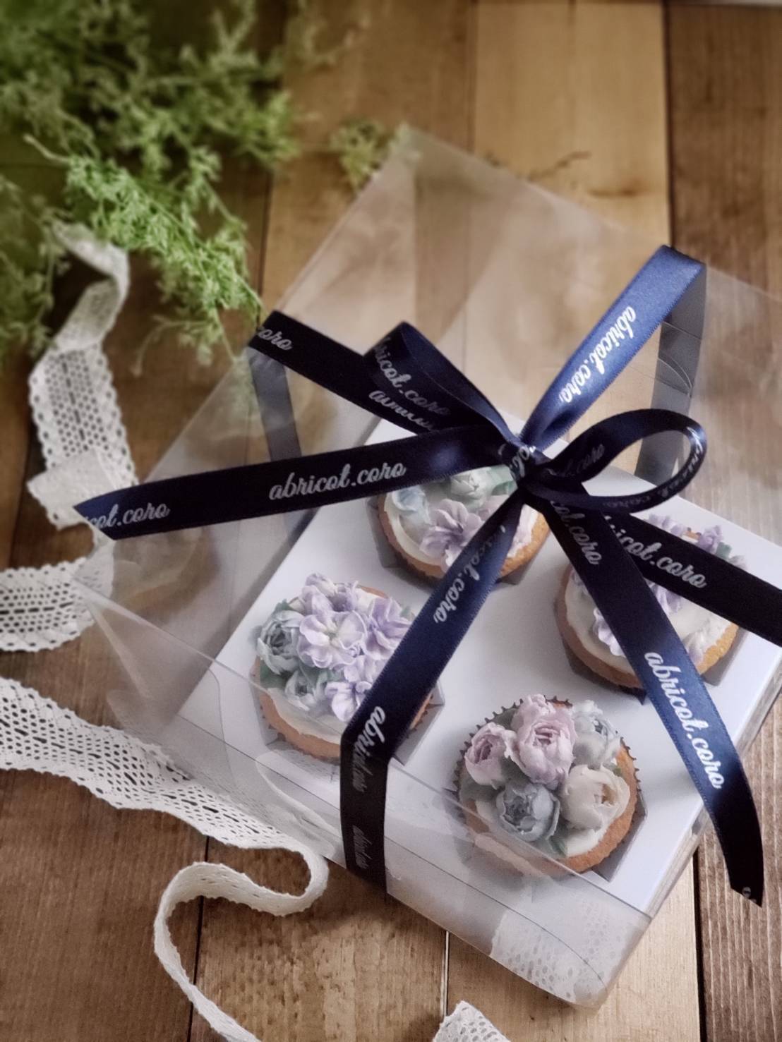 透明のクリアなケーキ箱に入れてフラワーアレンジメントの様に、召し上がる前にも目で見ても楽しめるようにしたいと思っています。