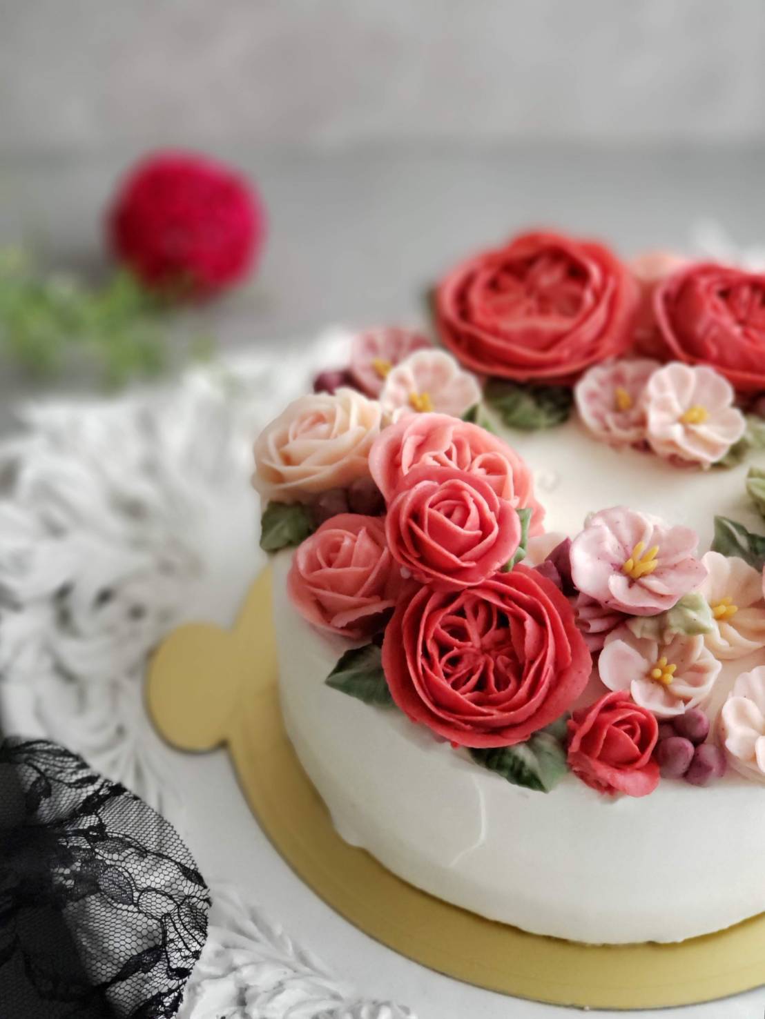 フラワーケーキとは、バタークリームや白あんのクリームで本物と見間違うほどのリアルなお花を絞り、フラワーアレンジメントの様にデコレーションしたケーキです。