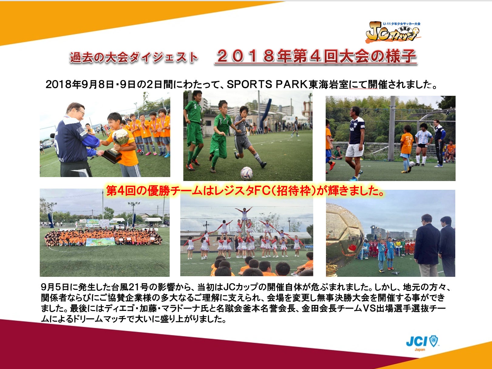 第4回大会は、西日本を襲った台風被害により、例年開催地であったJ-GREEN堺も大きな被害を受け、一時開催が危ぶまれましたが代替えの開催地や宿泊地が寸前で確保でき、何とか無事に開催することができましたに。直前の会場変更もあり、残念ながら親学や指導者セミナーを行う事はできませんでしたが、試合日程が全て終了した後にディエゴ・加藤・マラドーナ氏と名蹴会の釜本名誉会長、金田会長を中心としたスペシャルチームと出場12チームより選ばれた選手チームによるドリームマッチが行われました。