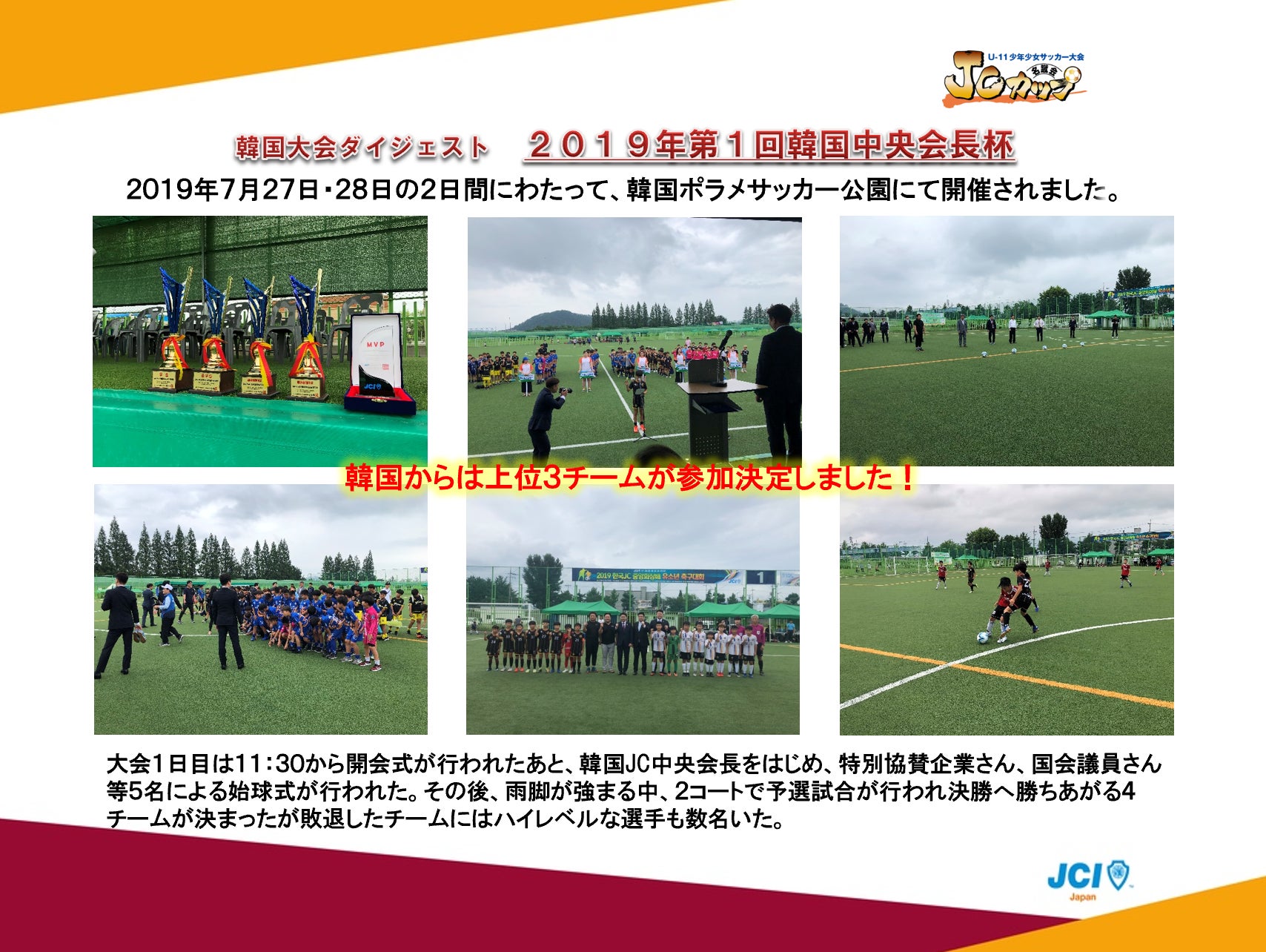 韓国JCとしてしては初の試みであり韓国サッカー連盟協力のもと選手やチームの参加規定、また大会要項が定められ全国から募集した結果8チームによる開催となりました。(韓国サッカー連盟に登録していない選手やチームは除外されているため、参加チーム数が少なかった)