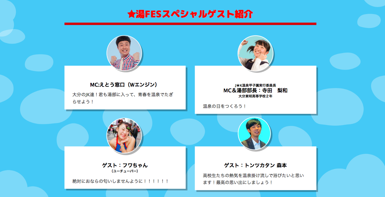注目を集め、興味を引き、参加してもらうために人気のユーチューバー「フワちゃん」やお笑い芸人トンツカタン森本さんにゲスト交渉!忙しいところ出演のOKをもらいました!!MCのえとう窓口さんは地元大分出身で、温泉名人、温泉マイスターの肩書きをもつ温泉大好き芸人です!