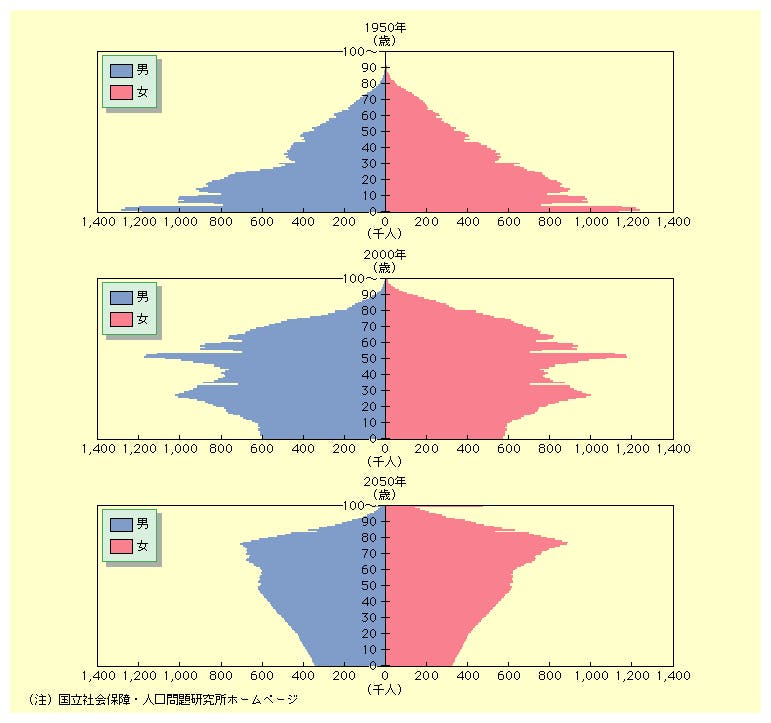 高齢化…さらには、少子化の影響を受け発生しているのが高齢化問題。下記の図は日本の人口ピラミッド。今後どんどんと少子化が進み、高齢者が多くなっていく。