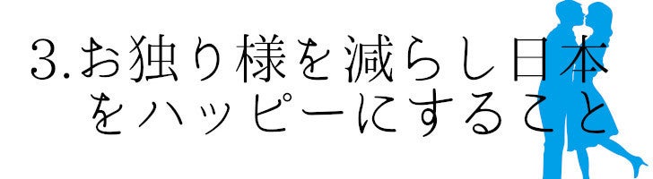 異性とうまくコミュニケーション出来ない人、結婚したい人達を支援して、子孫繁栄、ひいては日本全体を活気づけ、世界と戦える人材を!より自分に自信を持った生き生きとした人たちを増やしたい!