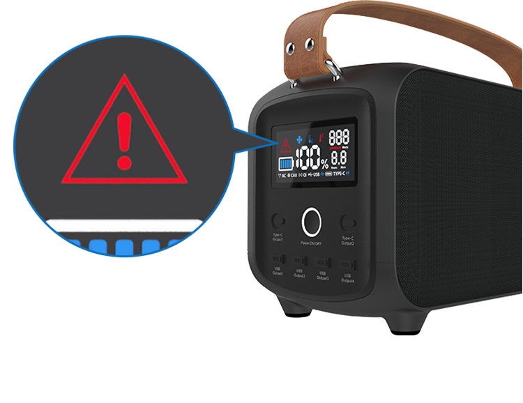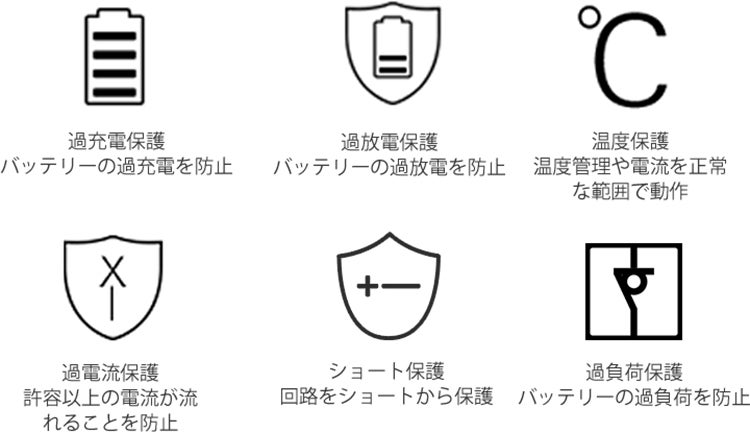 過充電・過放電・過電流・ショート保護機能を搭載。接続されているデバイスと製品本体を保護し、安心安全にご使用いただけます。 内部パーツに故障、もしくは異常があったときには故障マークが表示されます。