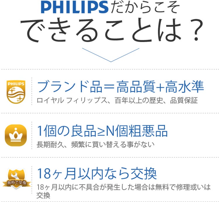 PHILIPS社は「Innovation and you」 (人々にとって意義のあるイノベーションを創造する)をブラインドラインとしています。本製品も当ブランドラインに沿って製作されており、18ヶ月の長期保証を設けております。