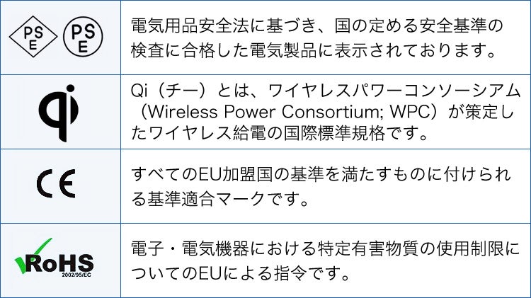 (PSEマーク、Qi充電など複数の品質に関する認証を取得中です)