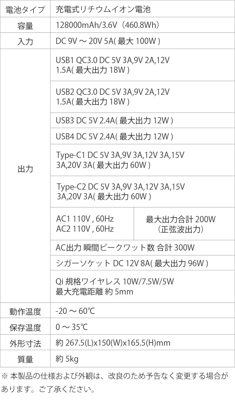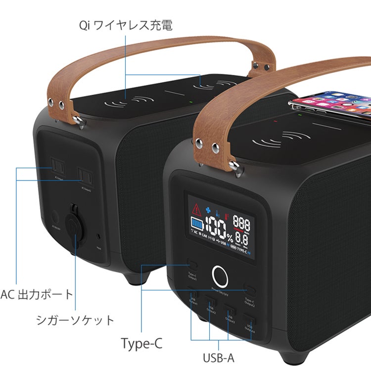 A:USBポート(1と2はQC3.0急速充電ポート)4口・Type-C(PD急速充電)ポート・2つのワイヤレス充電(5/7.5/10W)2口・AC(正弦波出力)2口・DC(12Vシガーソケット)1口を備えています。全てのポートから同時に合計で400Wの給電を行うことが可能です。