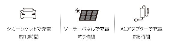 シガーソケットからも充電することができます。約10時間でフル充電が可能で、アウトドアでも活躍します。