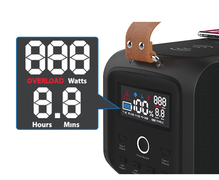 各状況を把握することができる大画面のLCDディスプレイを搭載。バッテリー残量、各出力口の利用状況、電池残量時間及び故障注意なども一目でわかります。