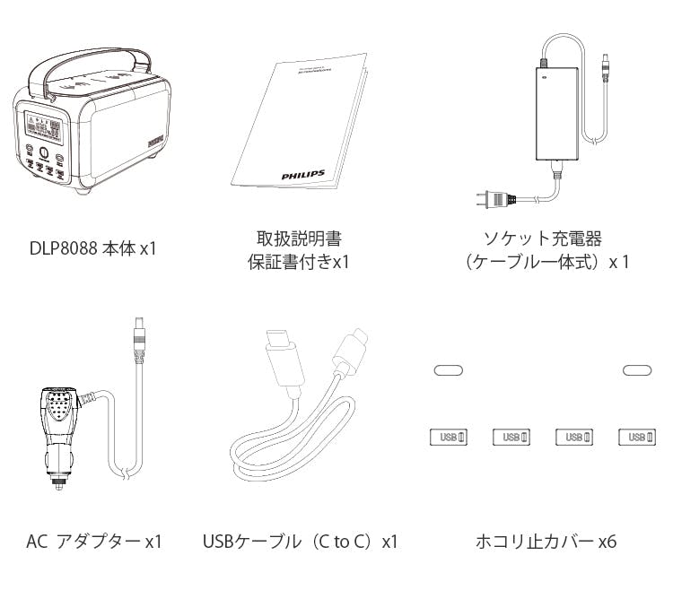 「DLP-8088NC」セットは、DLP-8088NC 本体 ×1、ACアダプター×1、ソケット充電器(ケーブル一体式)x 1、USBケーブル(C to C)×1、ホコリ止カバー x 6が含まれいます。また、収納バッグもお付けいたします!