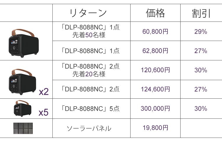 2019/09/30 14:55ご支援いただいた皆さま、こんにちは。雲集商事株式会社でございます 「ポータブル電源DLP-8088NC」をご支援頂き、ありがとうございます。本プロジェクトは、2,627,700円 のご支援金額を賜り、無事に終了することができました!全てはご支援くださいました皆さまのお陰です、本当にありがとうございました!リターン商品の発送は予定通り、進捗状況につきましては、随時活動報告を通じでご報告させて頂きます。もう一点が『商品の郵送先』の確認です。 『住所記載ミス』や『引っ越し』等で、商品戻りが発生しております。円滑の商品をお届けさせて頂きたいので今一度、配送先の住所確認のご協力をお願いします。お申し込み時にご指定いただいた配送先は、マイページよりご確認いただけます。変更があった場合は、マイページより住所変更の手続きをお願いします。今後ともをよろしくお願いいたします。 もっと見る