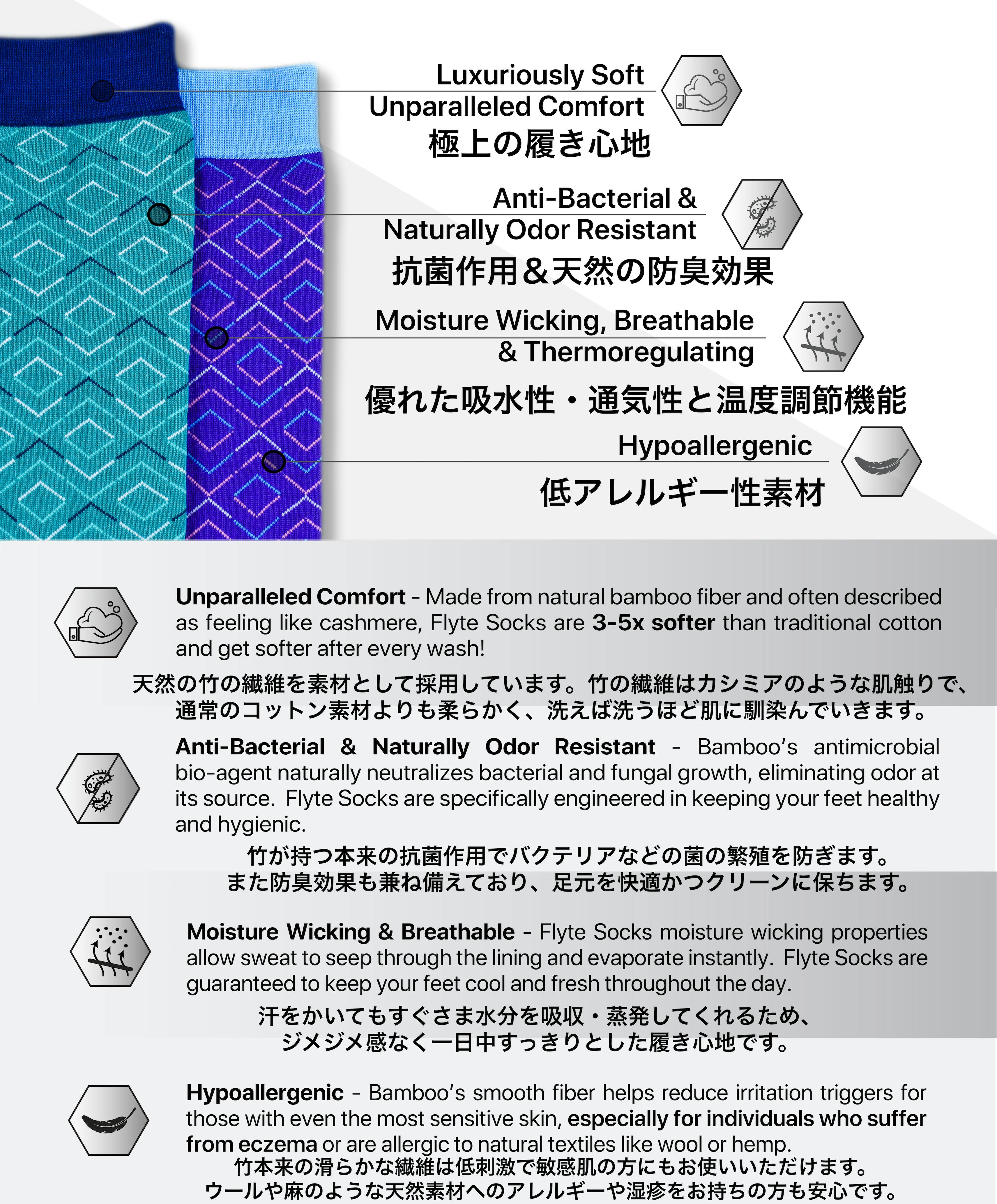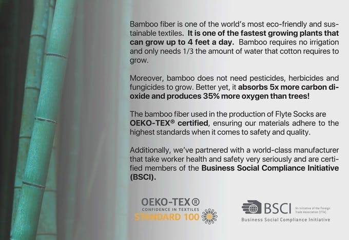 Flyte Socksに使用されている竹の繊維はOEKO-TEX(世界トップレベルの厳しい基準をもって、衣料品など繊維製品の安心・安全を証明する世界統一基準の独立検査・認証システム)により認証されたもので、その安全性と品質は最高級品質のものです。