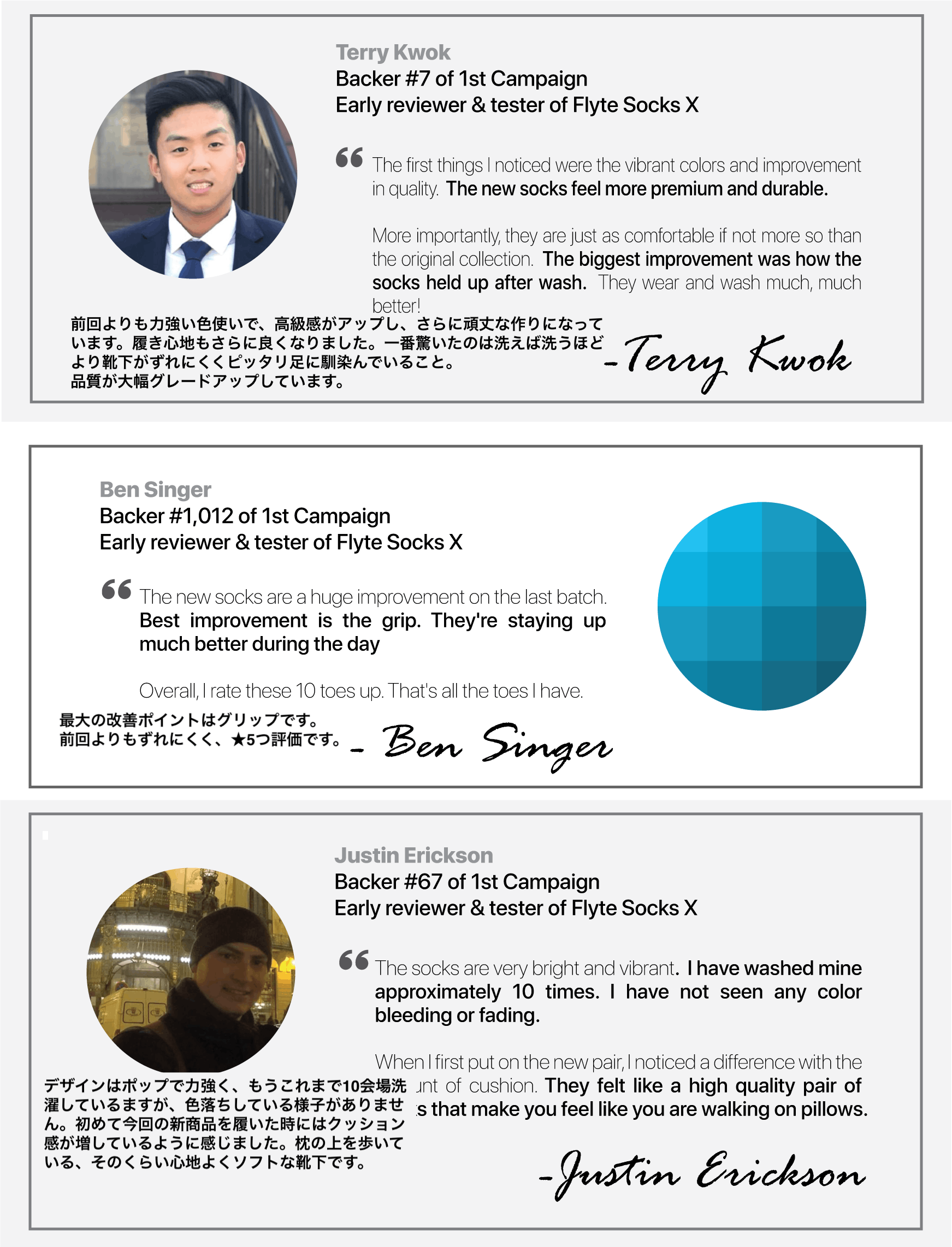 Kickstarterで初めてプロダクトを世に送り出した際にいち早くレビューを投稿していただき、今回の新商品リリースにあたってトライアルでFlyte Socks Xを使用いただいたユーザーからの声をお届けします。