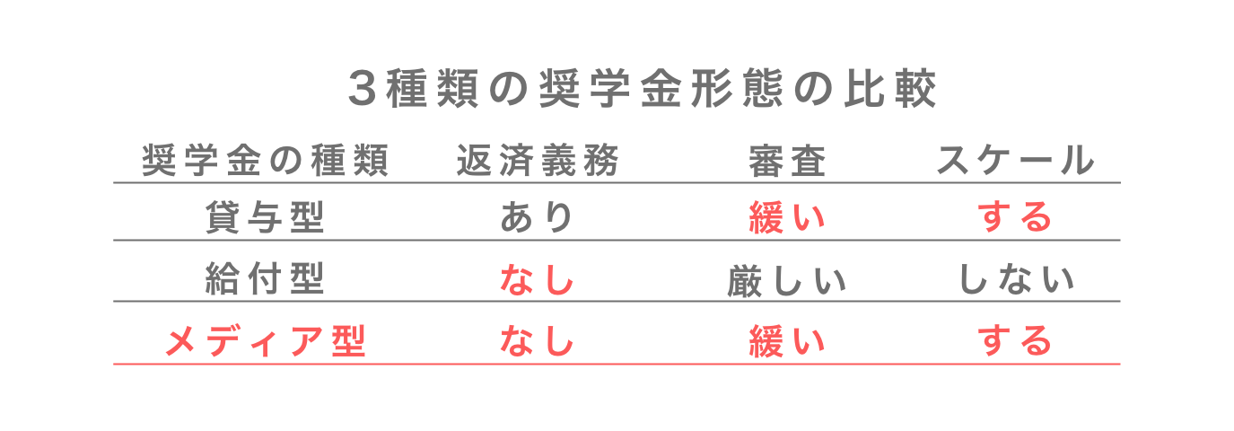 メディア型奨学金は貸与型奨学金と比べて返済義務がない点で優れており、給付型奨学金と比べて応募者数に応じて支援総額がスケールする点で優れていると考えられます。また、1人あたりの採択コストが1万円と非常に低いため、より多くの学生に「活動を発信する場」と「支援を受ける機会」の2つを提供することができます。