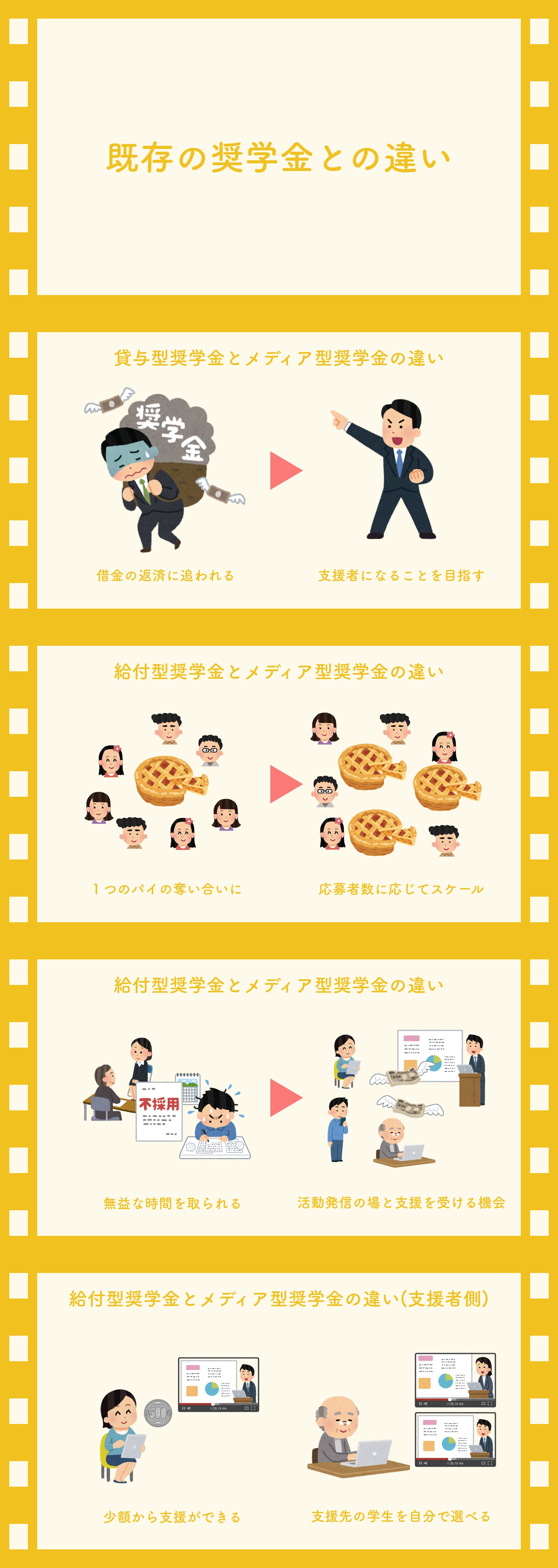 私たちはこの目的を達成するためにメディア型奨学金という新しいカタチの奨学金を作っています。