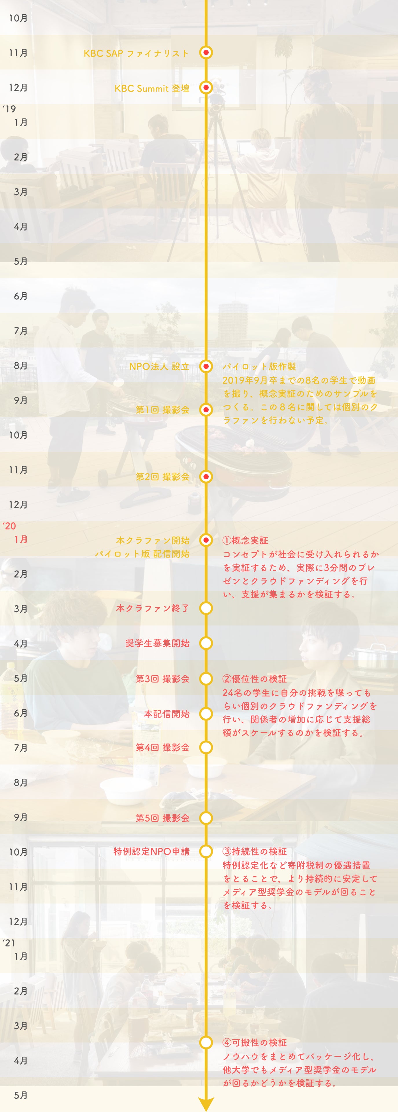 このクラウドファンディングによって得られた資金は、このクラウドファンディングの手数料とリターンの費用を差し引いた後、主に# ロードマップの「②優位性の検証」のために使わせていただきます。半年間をかけて24名程度の挑戦者について撮影・配信・追加の支援のクラウドファンディングを行うことで、#既存の奨学金との違いで述べたような優位性が本当に機能するのかどうかを検証します。