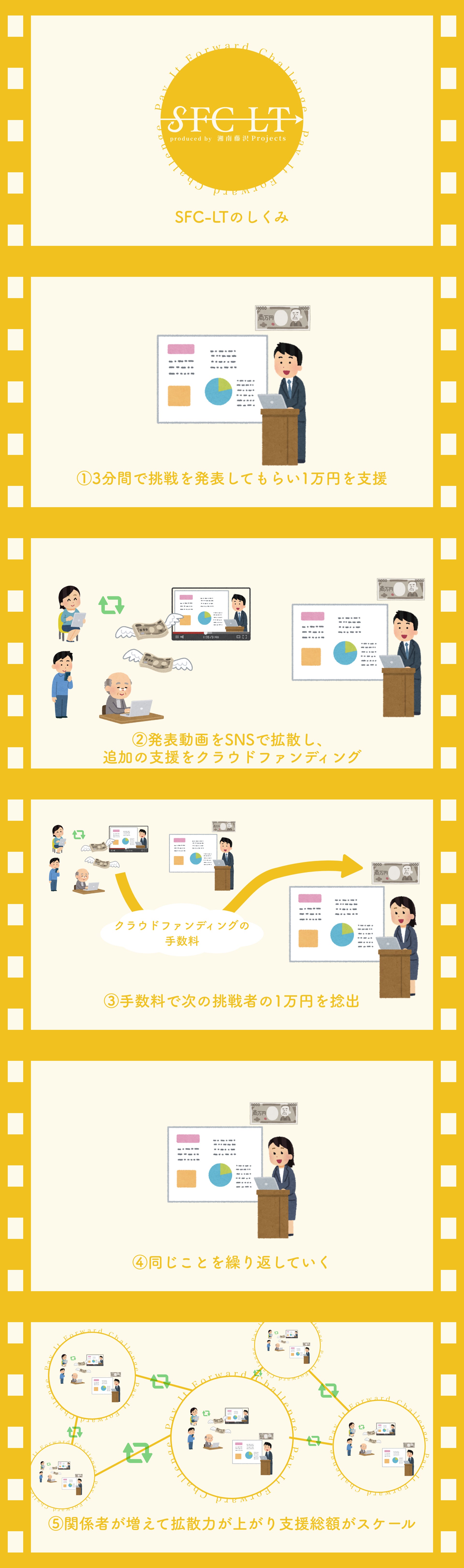 SFC-LTでは学生に3分間で自分の挑戦を発表してもらい、それに対して1万円を支援します。その発表の様子は動画に収めてSNSで拡散し、同時にその学生への追加の支援のクラウドファンディングを行います。そして、そのクラウドファンディングの手数料を用いて、次の学生の1万円を捻出していきます。