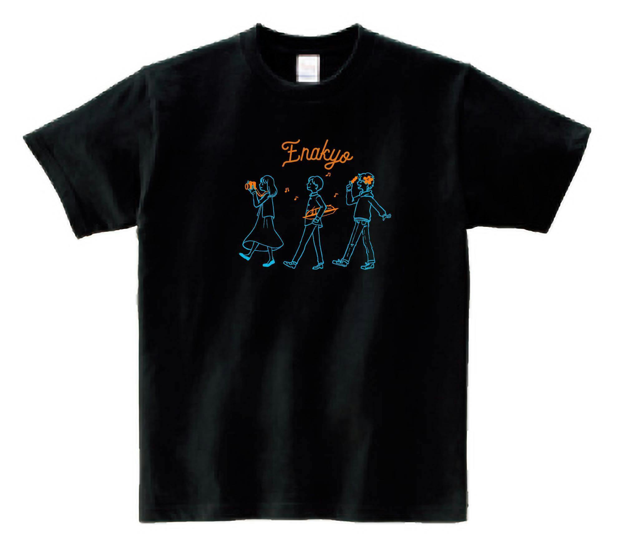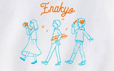 センターに「Enakyo」の文字、そして恵那峡の遊覧船、景色、グルメを表現した3人のイラスト。