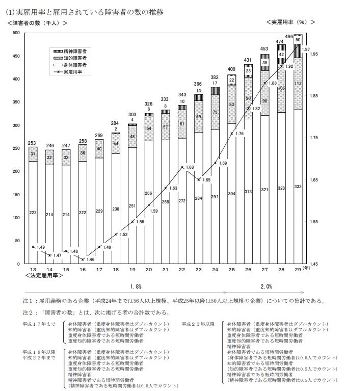 「実雇用率と雇用されている障がい者の数の推移」では、障がい者雇用は、年々増加傾向にあり、平成30年以降は実雇用率は2%を超えてます。