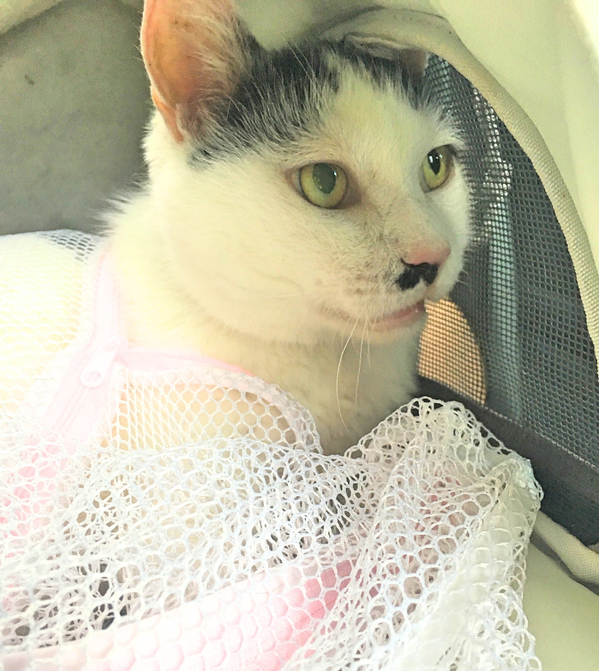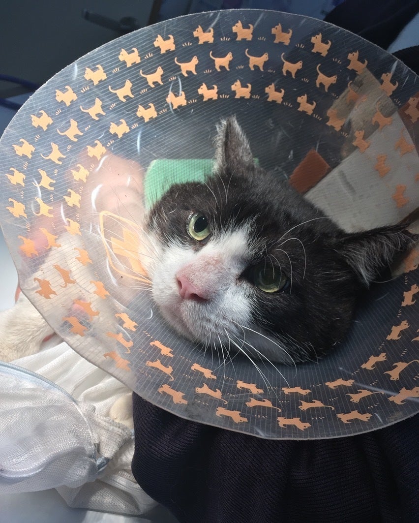 胸元に大きな怪我をして。。!きっと良くなるまで隠れていたのでしょう。毛は血で汚れていて、壊死した皮膚が剥がれてぶら下がっていました。痛かったね😿