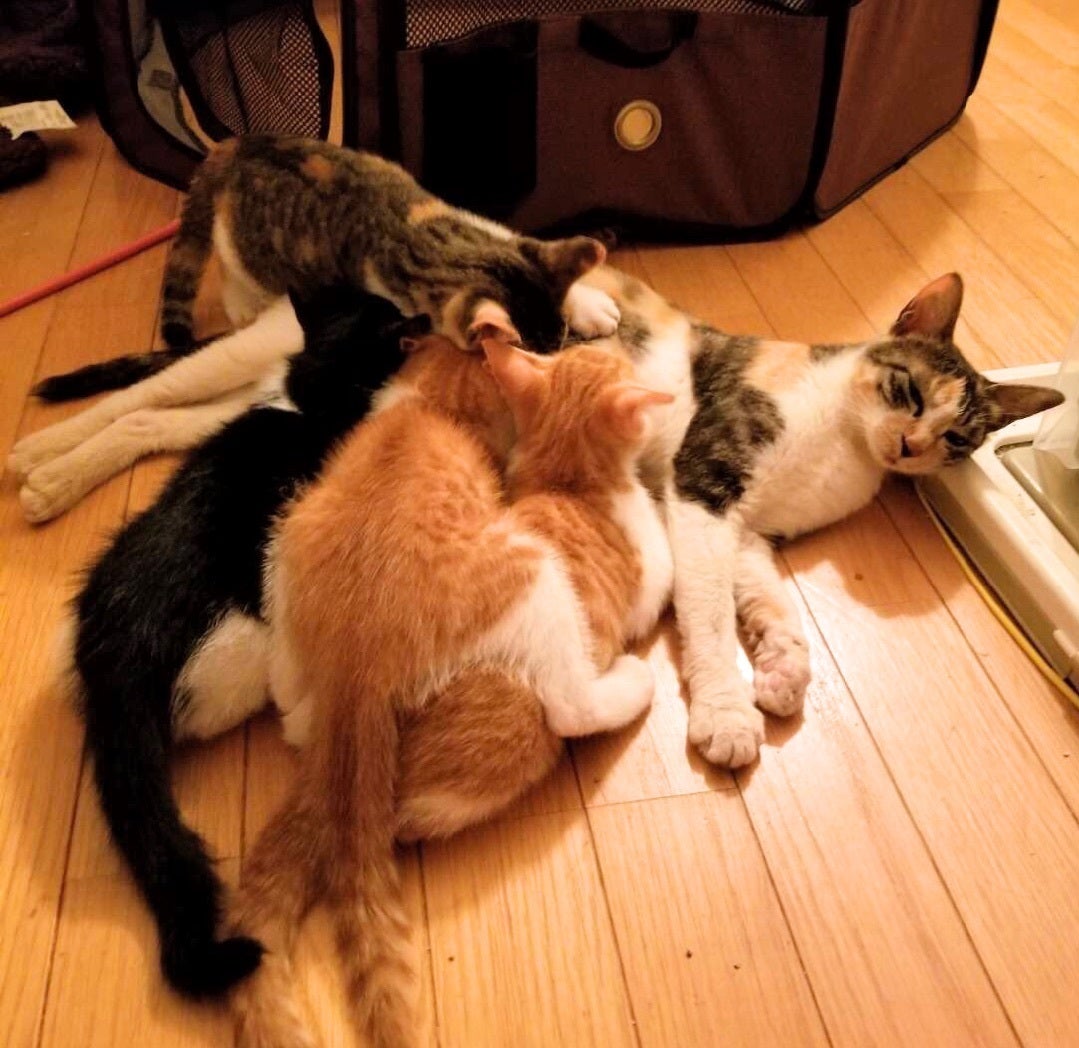 土手でカラスに襲われていた子猫ファミリー。ママ猫と一緒に保護。みんな栄養失調でケアが必要です。