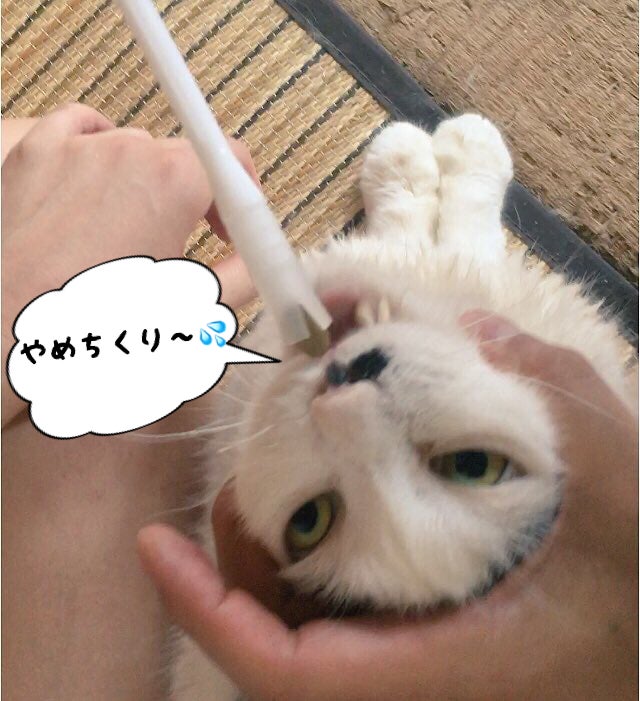 ウシは体が大きいので大粒の錠剤を1回で5粒も!必死の形相です。ごめんよ〜