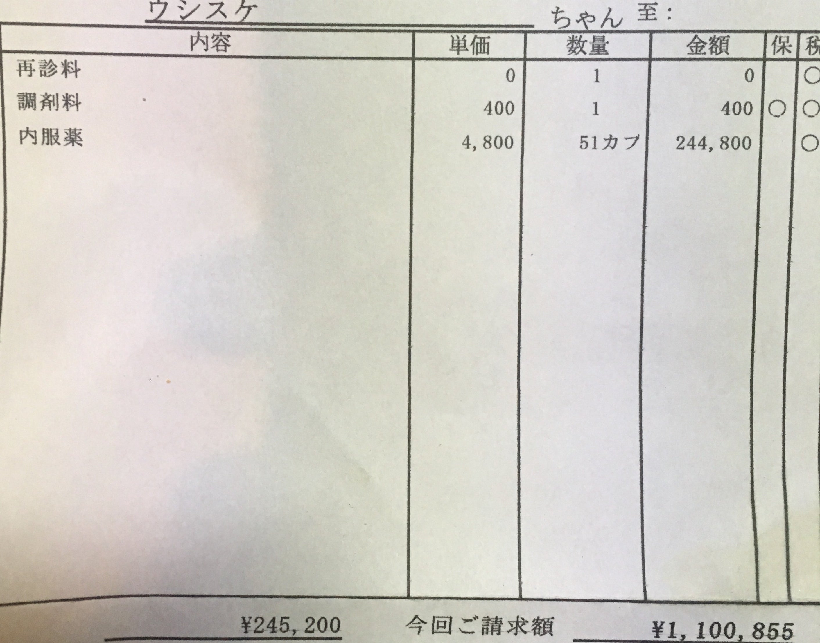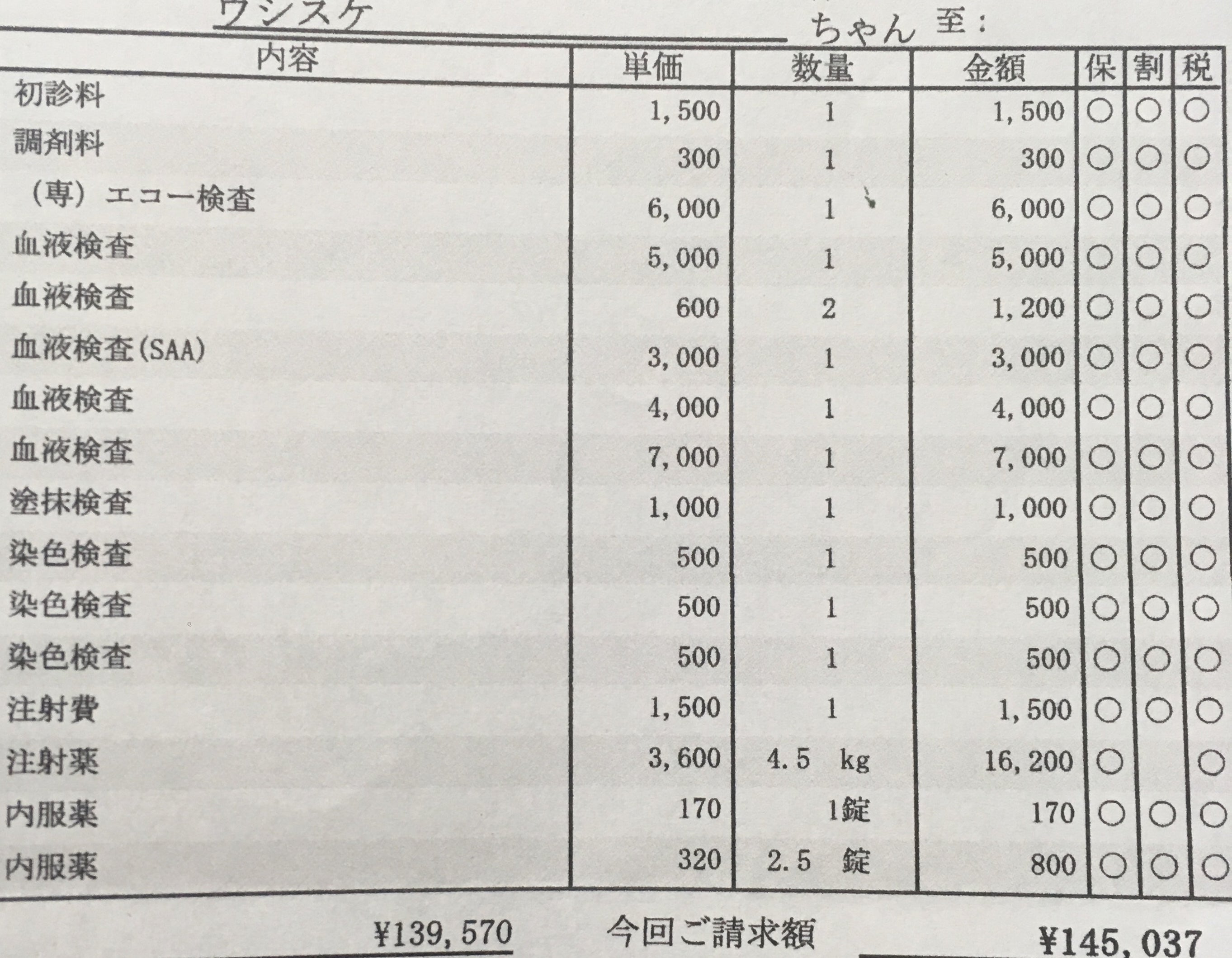 ウシ助のこれまでの検査医療費用(エコー、ウィルスチェック、入院、血液検査等)はなんとか支払う事ができました。