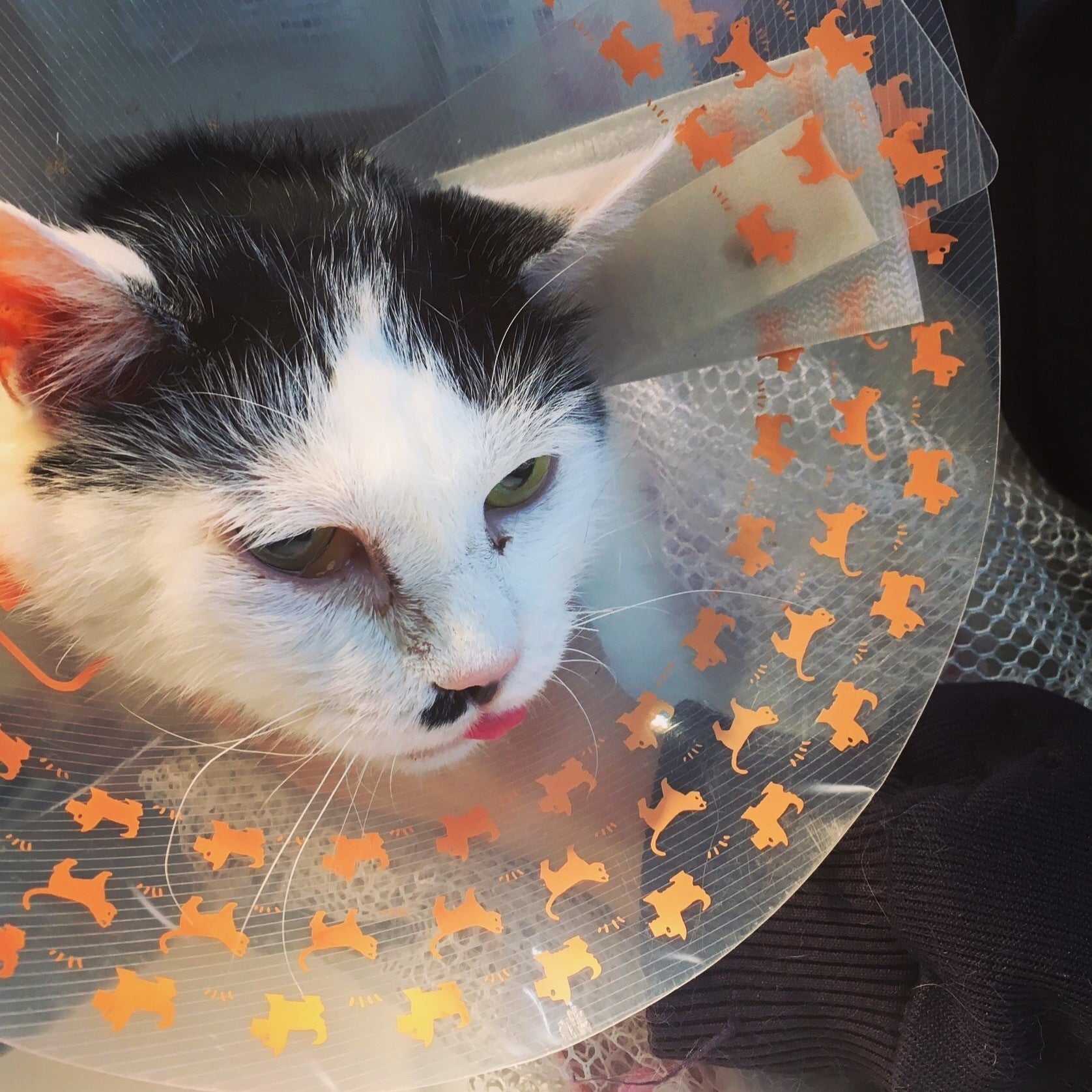 胸元に大きな怪我をして。。!きっと良くなるまで隠れていたのでしょう。毛は血で汚れていて、壊死した皮膚が剥がれてぶら下がっていました。痛かったね😿