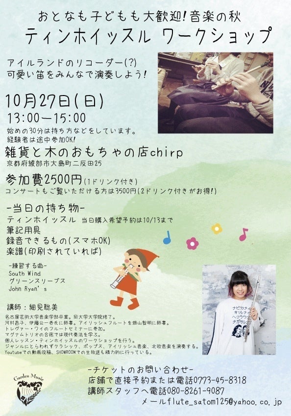 11月になりますので10/27の京都府綾部でのティンホイッスルワークショップ&コンサートでは予約販売のみ受け付けます。