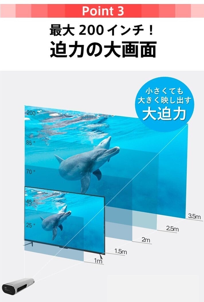 ③ 映し出す画面の最大サイズは 200インチ! 映画やゲームも大画面で。