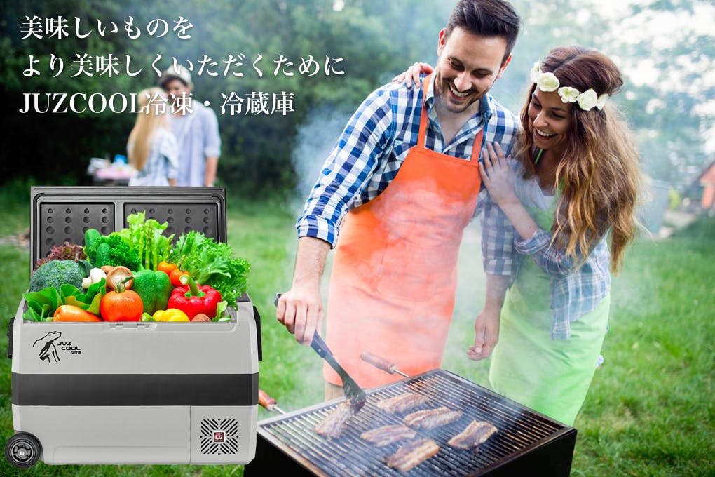 キャンプには、施設を利用しない大自然型キャンプと、炊事場や電源設備の整った施設を利用するキャンプがありますが、ほとんどの方は後者の施設型キャンプを楽しまれているでしょう。レジャーで利用されるポータブル冷蔵庫は、利用頻度はそれほど高くない一方で、一度購入したら10年といった長期で利用したいものです。JUZCOOLはこの点に着目し、耐久性の高いLG製コンプレッサーの採用を始めとした長寿命設計に配慮するとともに、製品寿命を短くしてしまう内蔵バッテリーを敢えて取り除きました。キャンプ場への移動中は車載電源から給電し、到着したら施設に装備されているAC電源を利用して給電するのがJUZCOOLの使い方。でも、AC電源設備がない場所でも大丈夫。JUZCOOLは市販の大容量バッテリーでご利用いただくことも可能です。