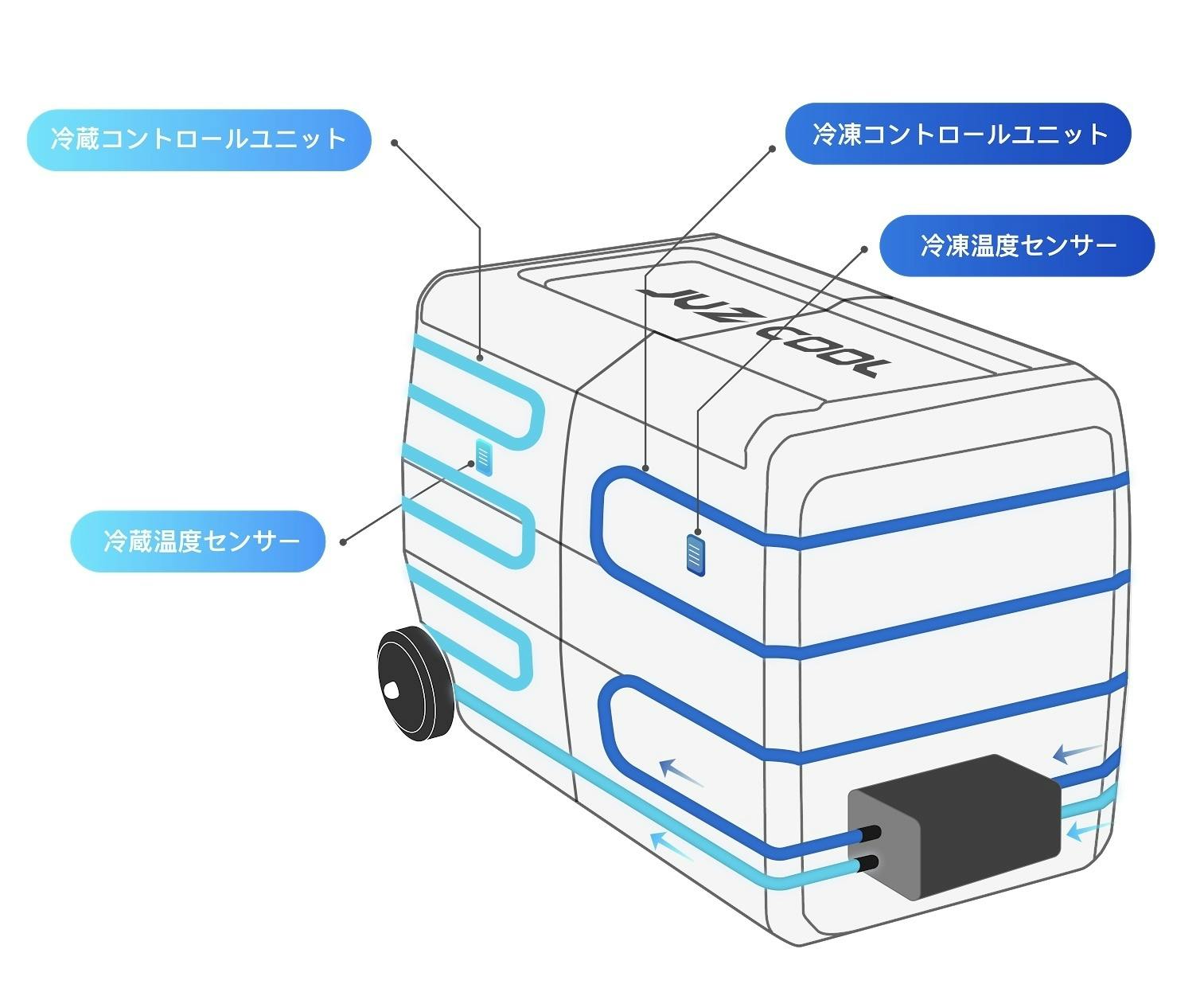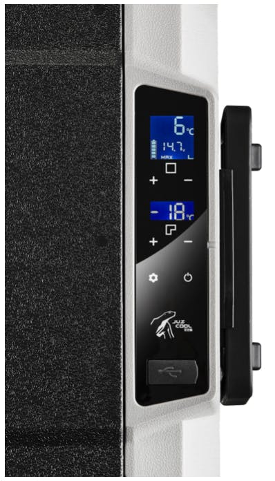 JUZCOOLは、専用のリードスイッチ設計によりパーティションを検出し、庫内が2槽に分かれていることを判別して、対応する冷媒パイプのバルブを開き、高速で効率のよい冷却を実現しています。高速に冷凍する食材と、冷蔵して新鮮な状態に保つ食材とをわけて収納し、それぞれのゾーンを個別に温度制御できるので、JUZCOOLが1台あれば、長い距離を移動した後でもいつでも最適に保冷された新鮮な食材が提供できます。