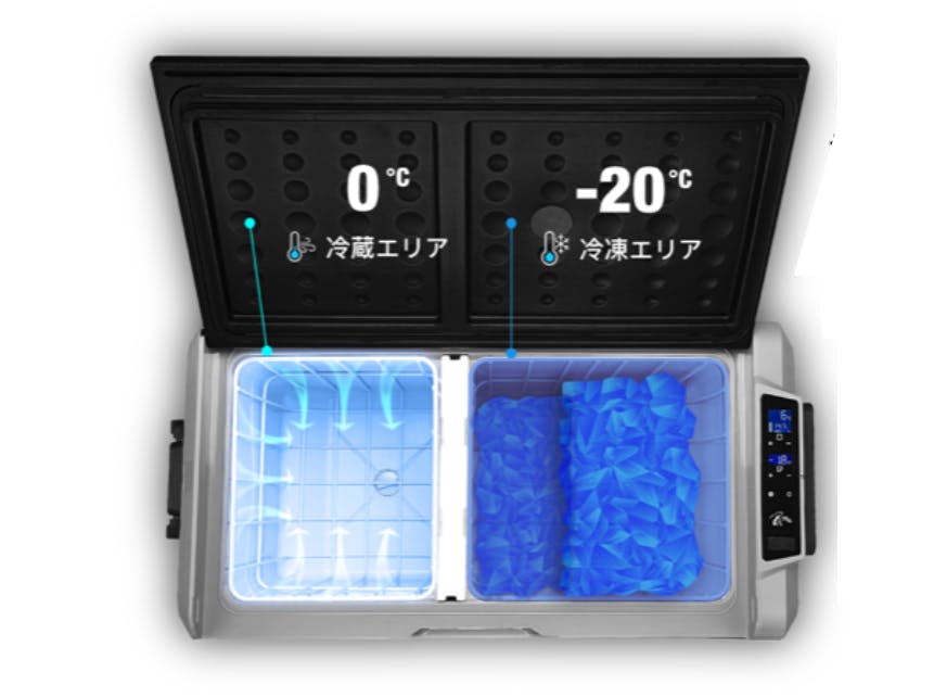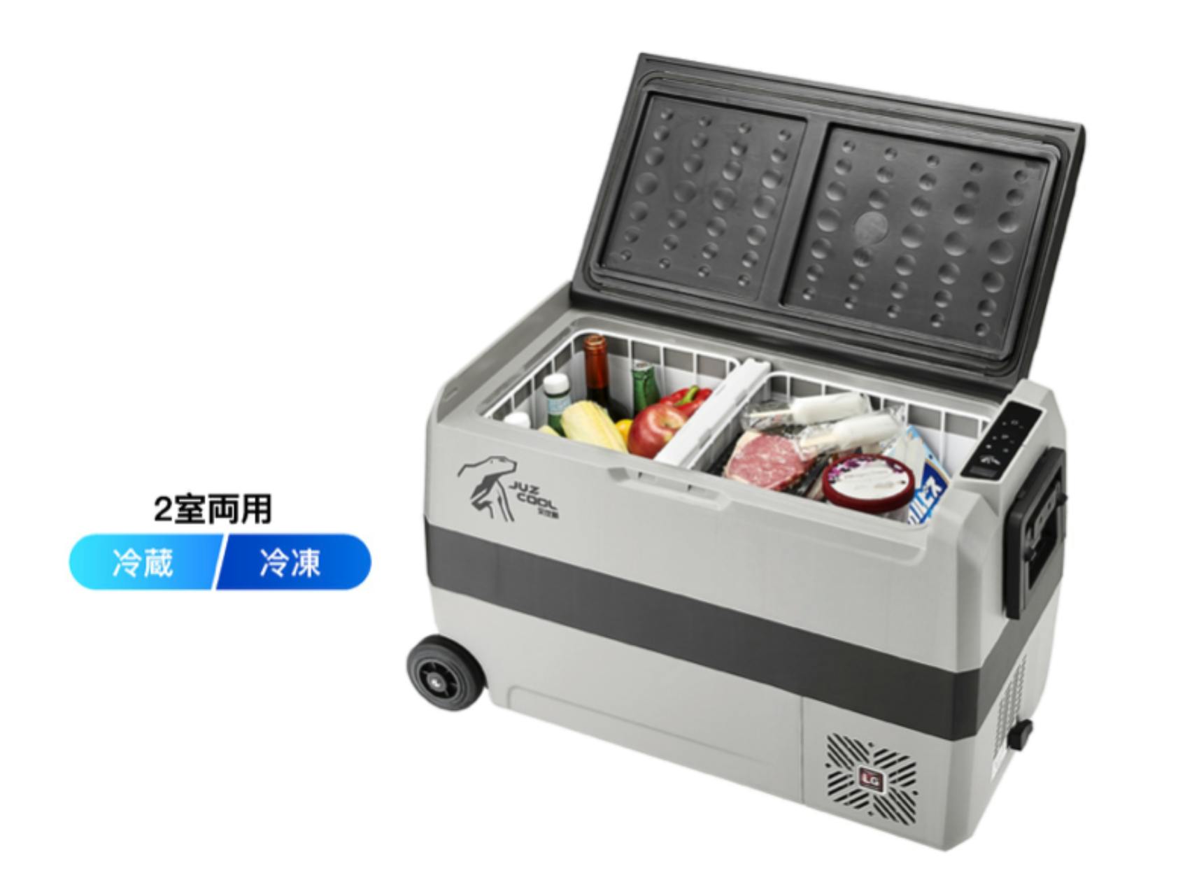 保存温度の異なるアイスクリームなどの冷凍食品と、フルーツや飲み物などの食材をそれぞれの適正温度で保冷するために、JUZCOOLは2つのゾーンで独立した温度管理が行えるようになっています。