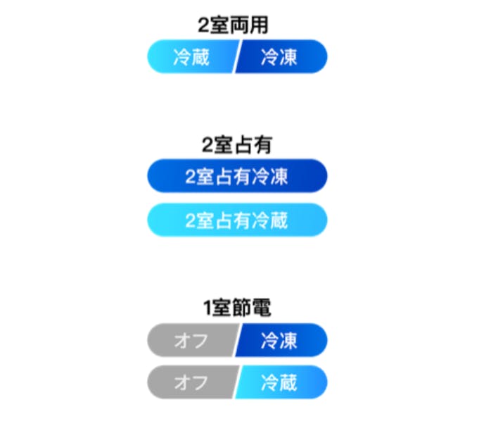左は冷蔵、右は冷凍に初期設定されています。冷蔵ゾーンの低温は0度に設定することをお勧めします。冷凍ゾーンは収納する様々な材料に応じて-20度まで急速冷凍できます。