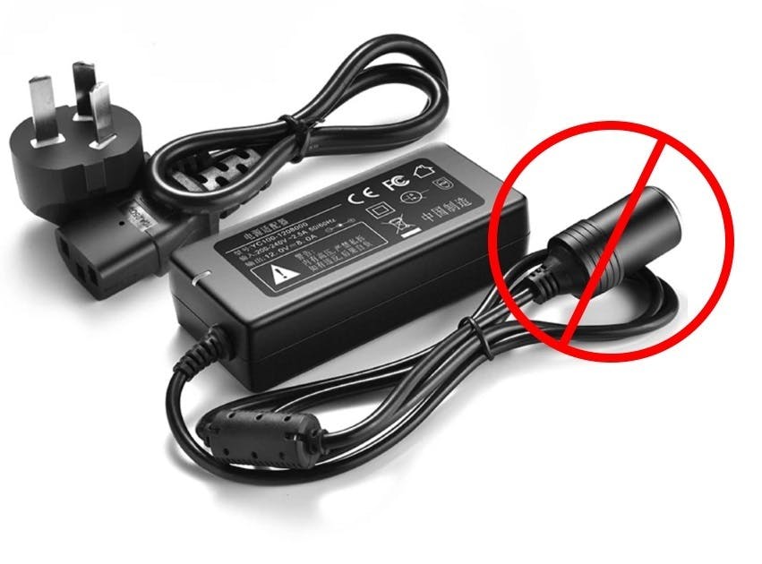 これに対し他社のポータブル冷蔵庫では一般的に、下の写真のような電源アダプターで家庭用コンセントの電力を自動車の電源と同じ12Vに変換して冷蔵庫に供給しています。しかし、この方式では安定した電力を供給することができず、コンプレッサー損傷の主な原因である不安定な電力が問題になります。冷蔵庫の製品寿命は最適な電源供給により長くすることが可能です。JUZCOOLでは、専用の電源アダプターが14.5Vの高い出力電圧で最大87Wの電力需要に対しても常に安定した電源供給を行います。