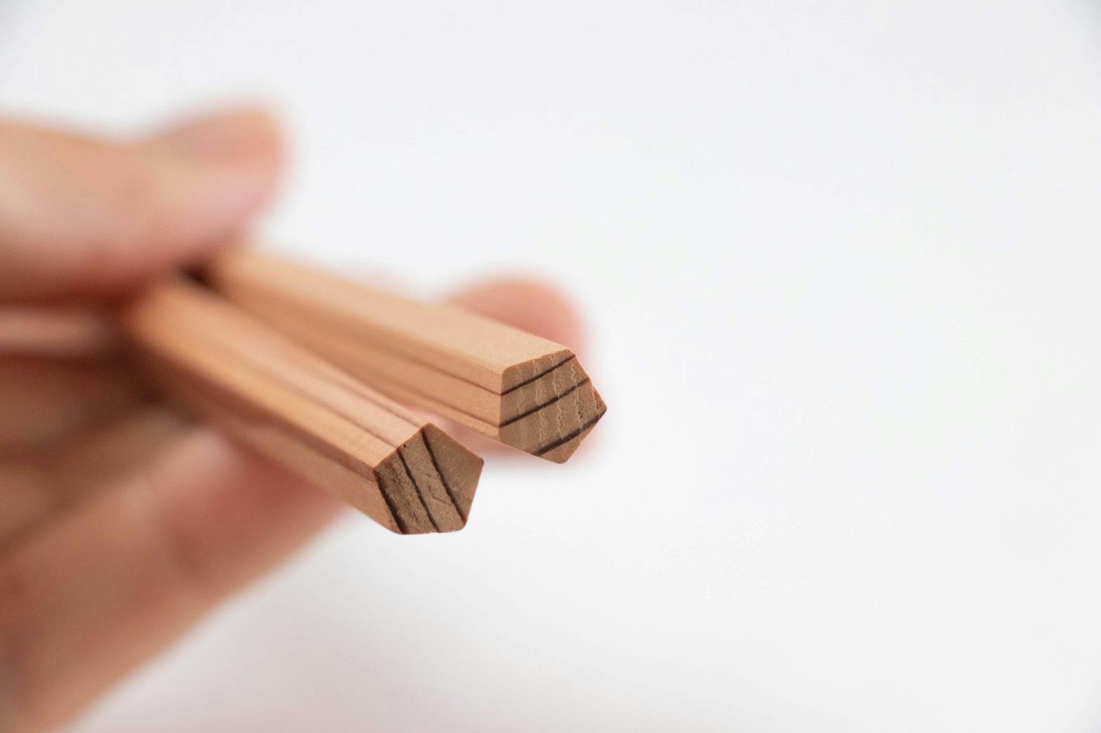 この箸に使われている木頭杉は、徳島県南部の那賀川上流、温暖多雨な木頭(きとう)で育まれて奈良時代から使用され、大阪城築造や下鴨神社造営に使用されてきた歴史ある杉です。 この木頭杉の心材(中心部に近い部分)を厳選。美しい朱色をしていることから「木頭朱杉(き とうあかすぎ)」と名付けられ、ブランド化されました。