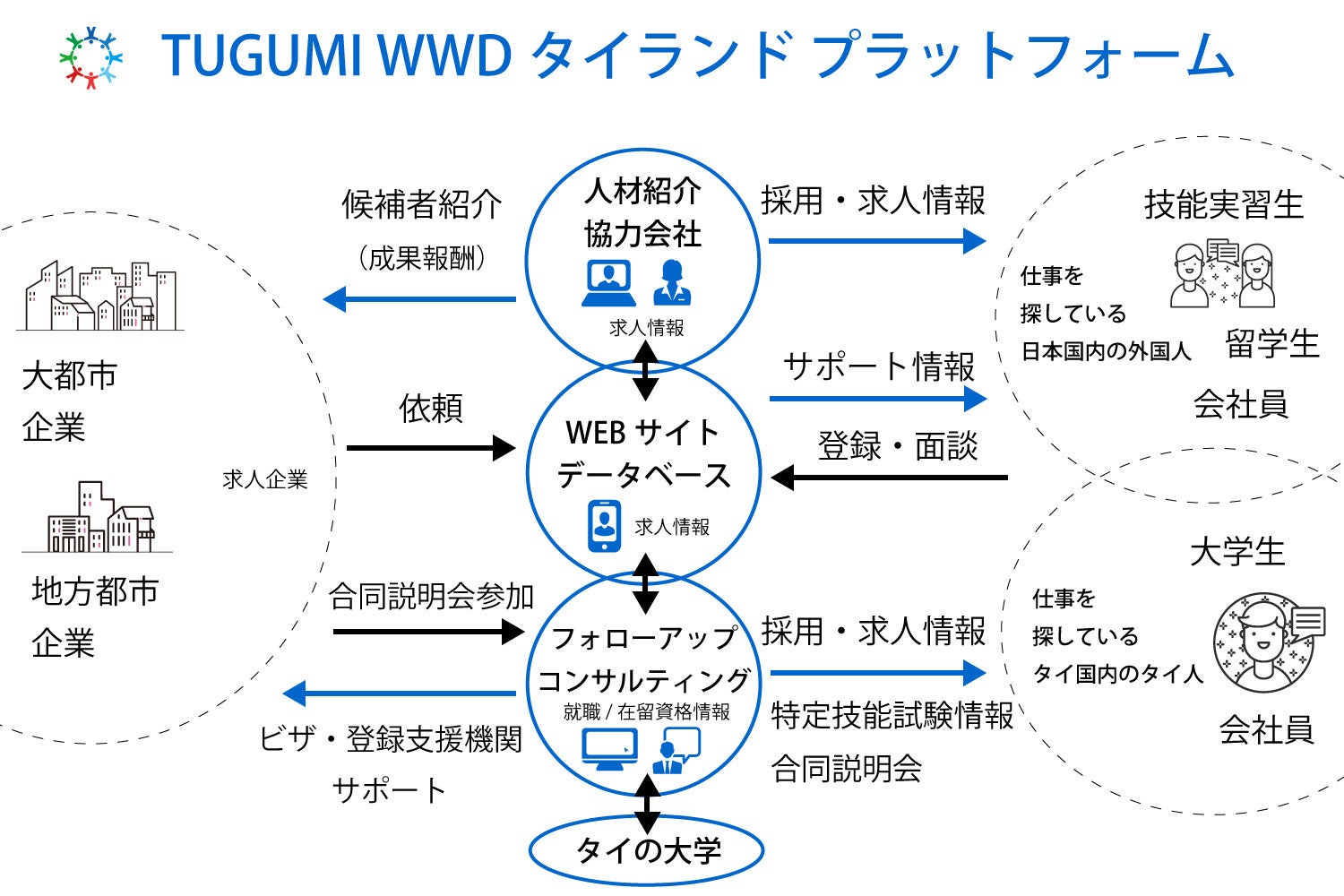 制作中に、このシステムって外国人にも当てはめられるかなと思い、外国人の知り合いが多いタイ在住4年目で同僚である相原さんにアンケートをとってもらうと、想像以上に日本で働きたい人が多く、また就職活動に関する問題点も多かった。それならタイも含め世界中の人が日本で働けるシステムを自分たちで創ろうと発起し、相原さんも参加するコトで、「TUGUMI-WWD」のプロジェクトを立ち上げるに至りました。