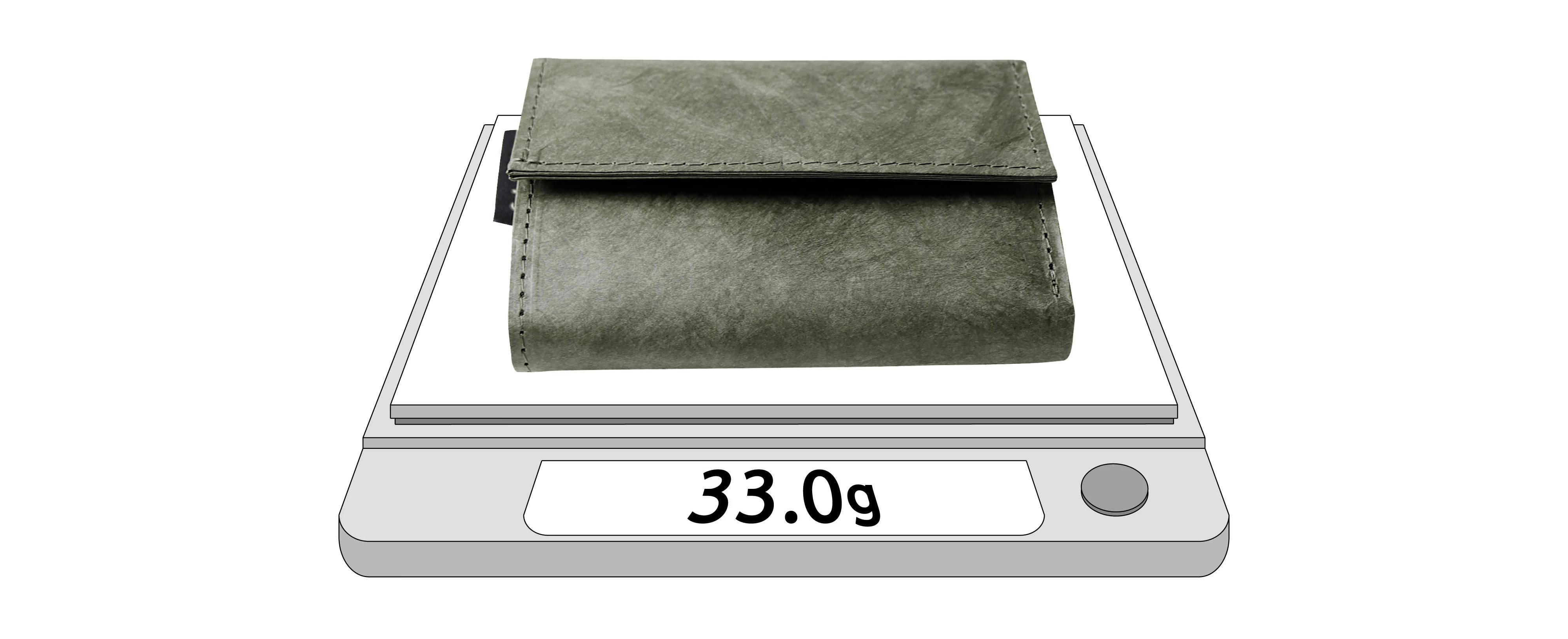 ▼タイベックは紙のように軽く、本体はわずか” 33.0g ”。お財布に中身が入った状態と従来の革財布を比較しても、とても軽いのが特徴です。