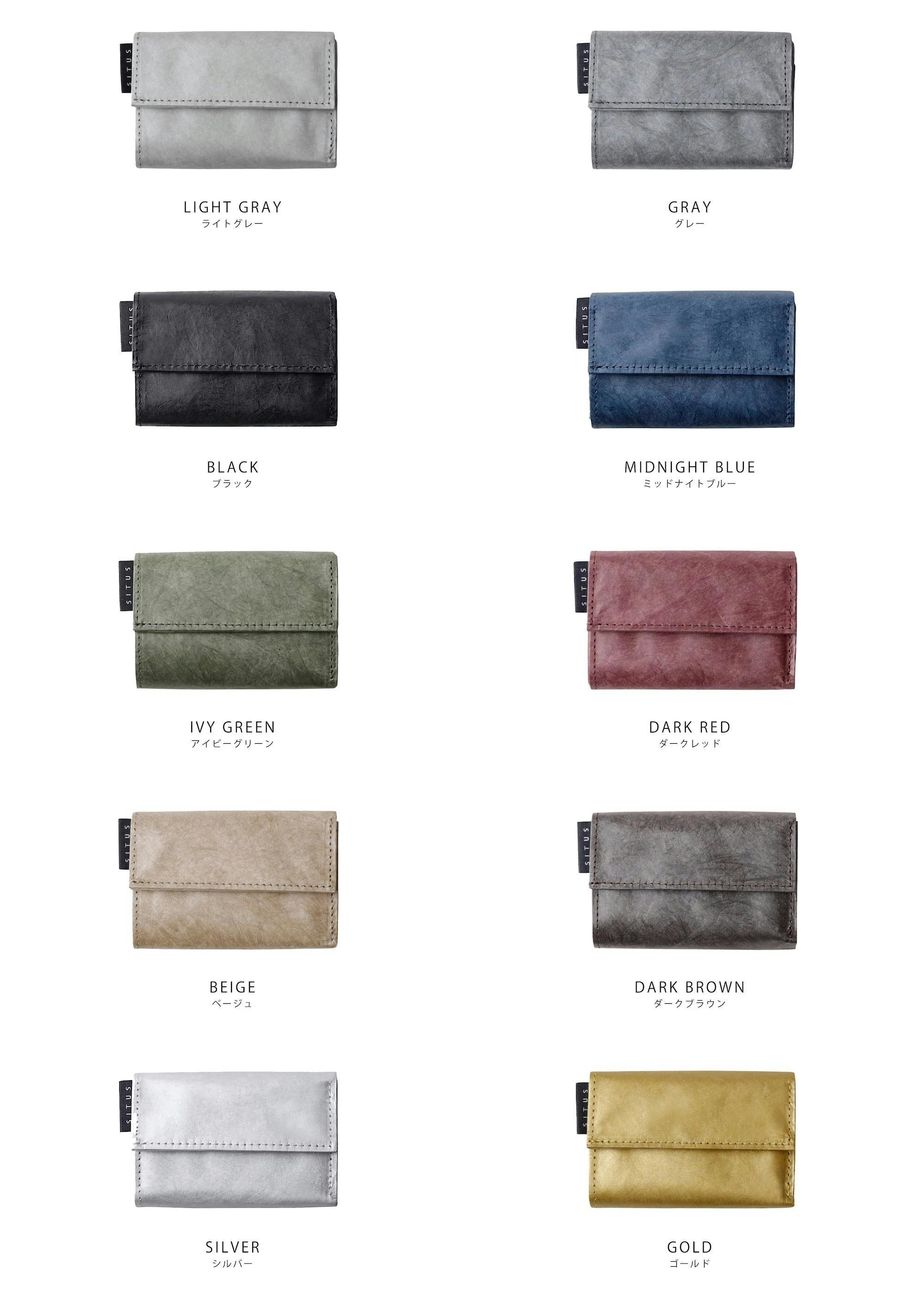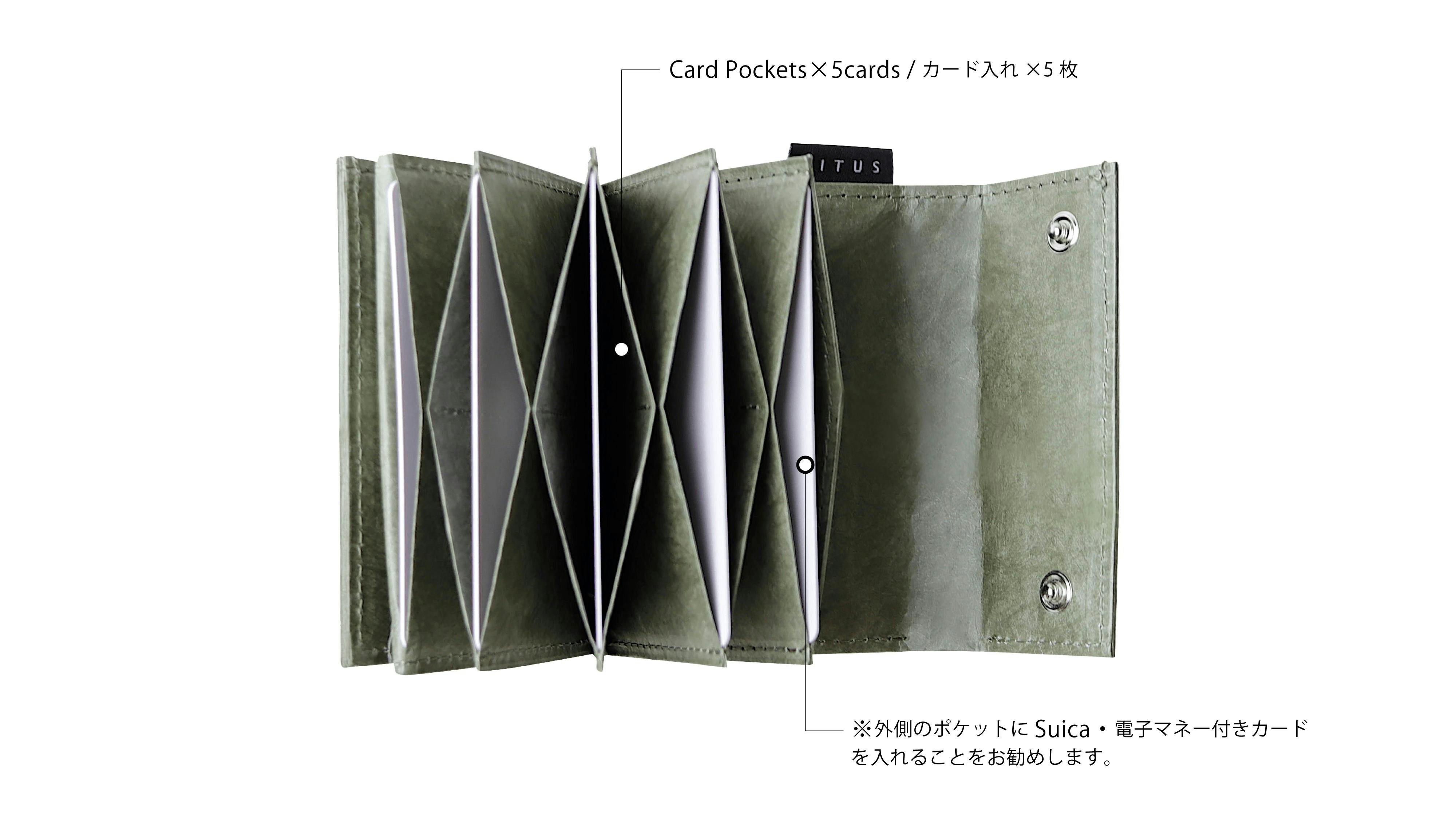非常に持ちやすく握りたくなるサイズ感は、コンパクトで見た目もスタイリッシュなデザイン。内部のカードポケットは、重ね合わせたh50㎜×w190㎜のパーツを互い違いに縫い合わせた構成になっており、開けた時に見えるひし形の幾何学模様が特徴的で見る人の目を惹きつけます。札入れはコンパクトサイズでありながら、紙幣を折り曲げずに収納が可能。素材はTyvek®(高密度ポリエステル不織布)という、薄さ、軽さ、耐久性、耐水性、加工性を兼ね備えた素材を使用しています。何枚ものパーツを重ね合わせる構造を持つこの財布には、最も適した素材といえます。Tyvek®(高密度ポリエステル不織布)のもつ「紙」のような外観や質感は、よりこの財布の魅力を引き立たせてくれています。