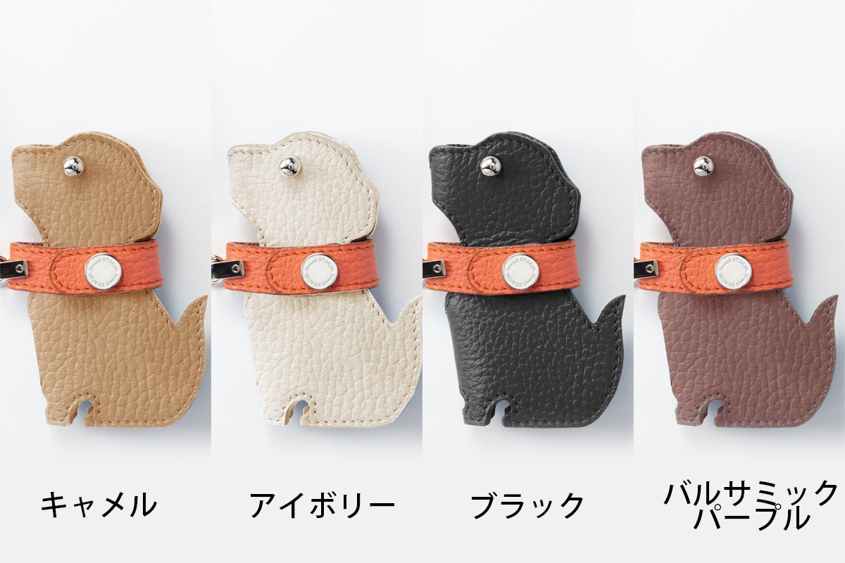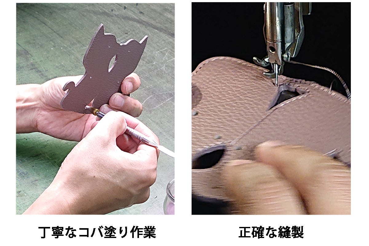 この製品は、シンプルでありながら愛らしく、そして犬種を区別できるようにデザイン化しております。 その為、デザインはカ-ブや反り返り部分が多く、コバ塗りや縫製など全ての作業に高い技術力が要求されるものになりました。