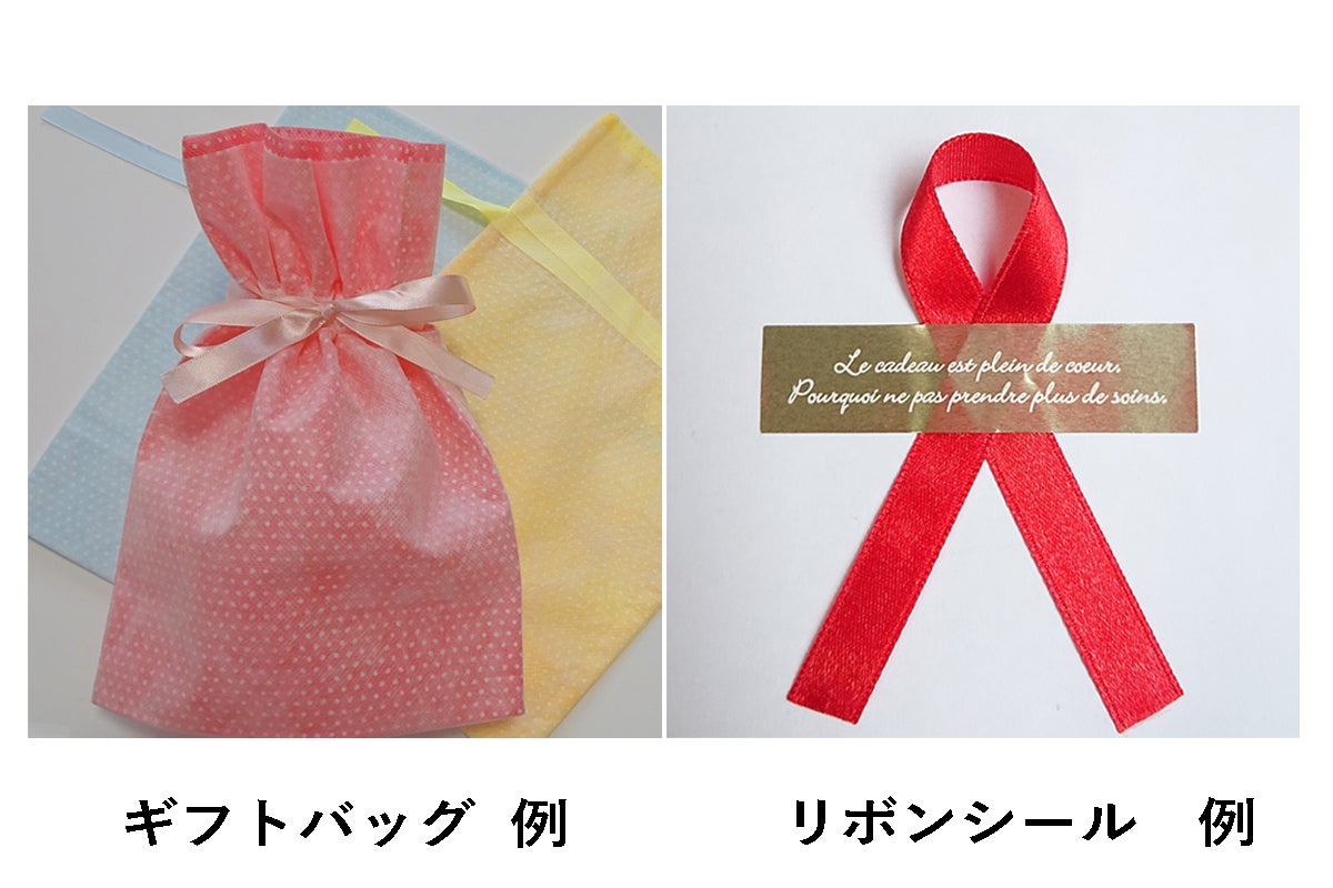 納品の際には、全商品に「不織布ギフトバッグ」と「リボンシール」を同封いたします。