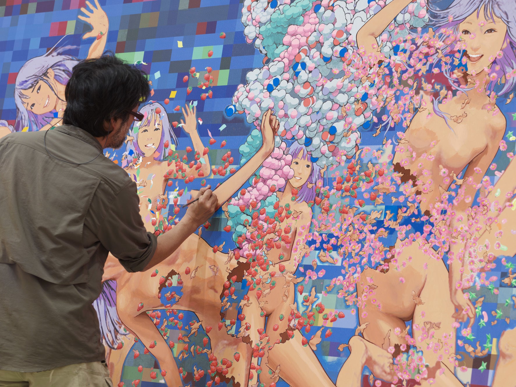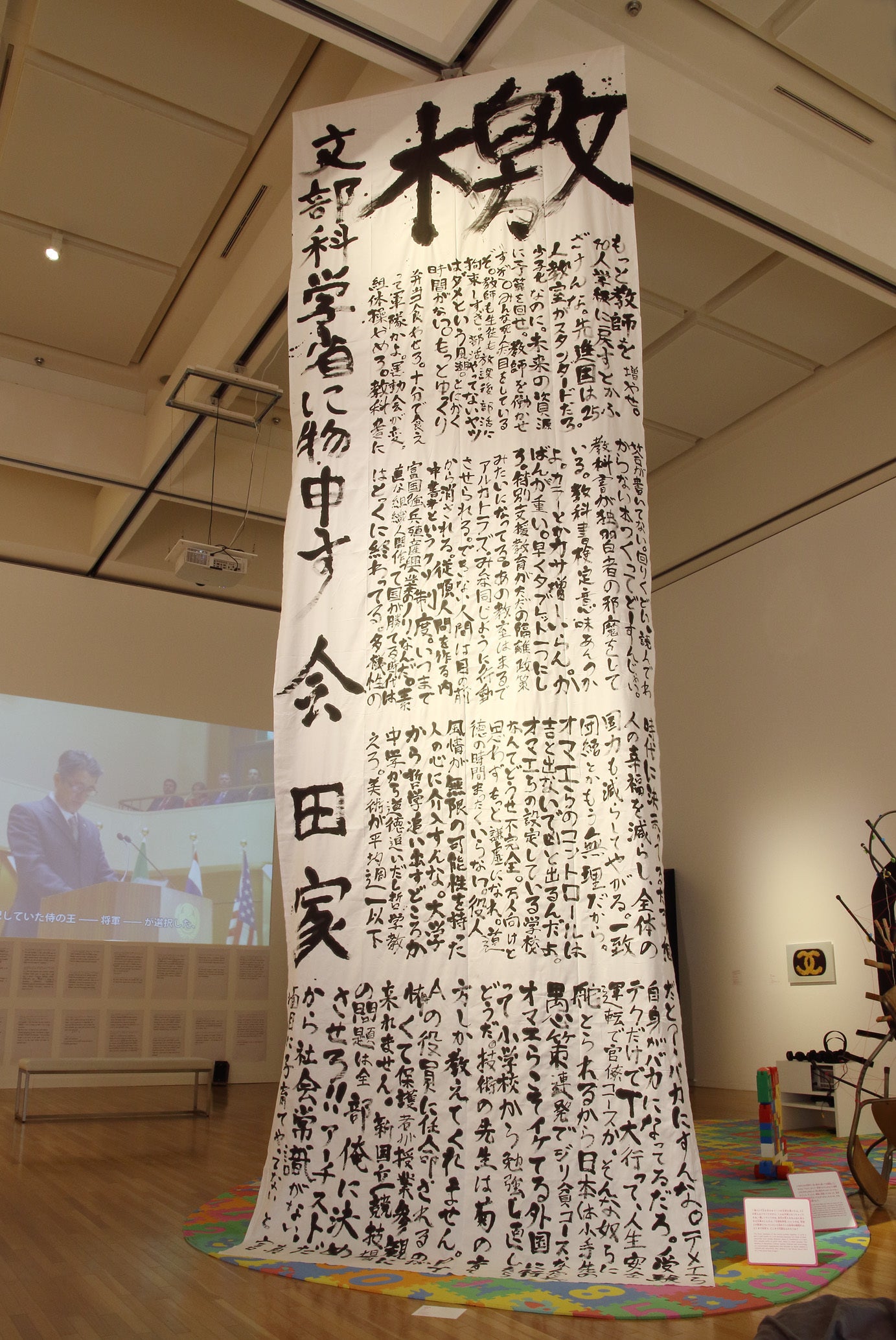 2015年、東京都現代美術館で開催された「おとなもこどもも考える ここはだれの場所? 」展にて、市民からの抗議を受けて、美術館側から撤去の要請があった、会田誠の家族3人による会田家《檄》2015 展示風景 2015 撮影:宮島径 (c) AIDA Family Courtesy Mizuma Art Gallery