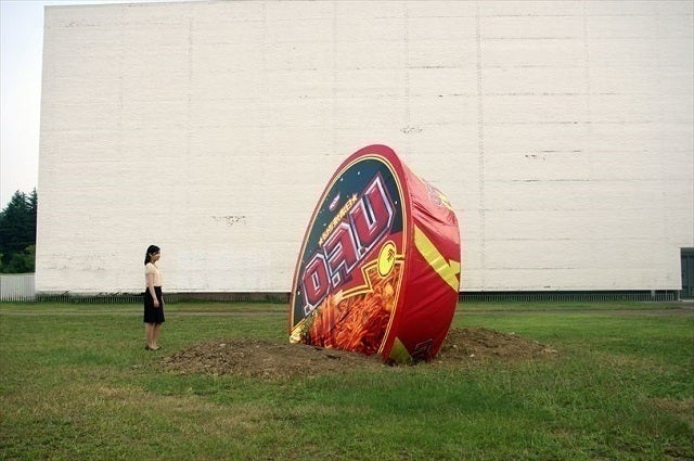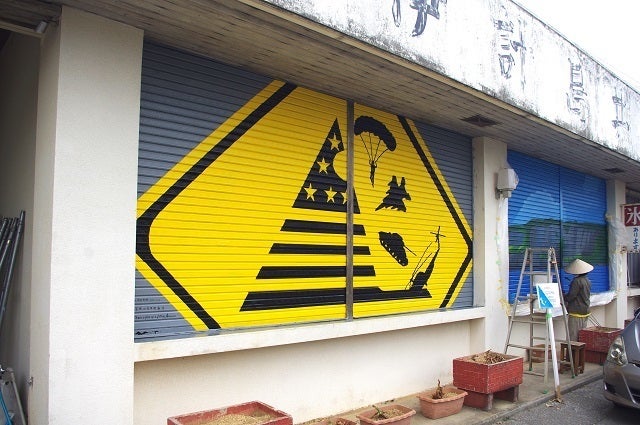 2017年、沖縄県の伊計島で開催された「イチハナリアートプロジェクト」にて、展示開始直前にベニヤ板で封印された、岡本光博の作品《落米のおそれあり》