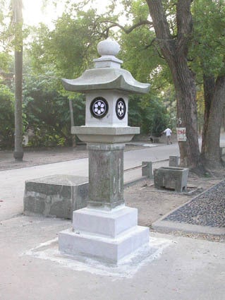 殺害予告を受けた、岡本光博《橋仔頭神社境内再現プロジェクト》2005 台湾の日本統治時代の神社を写した2枚の写真と当時を知る人々へのインタビューを元に、現地に石燈籠等、神社の一部を復元。